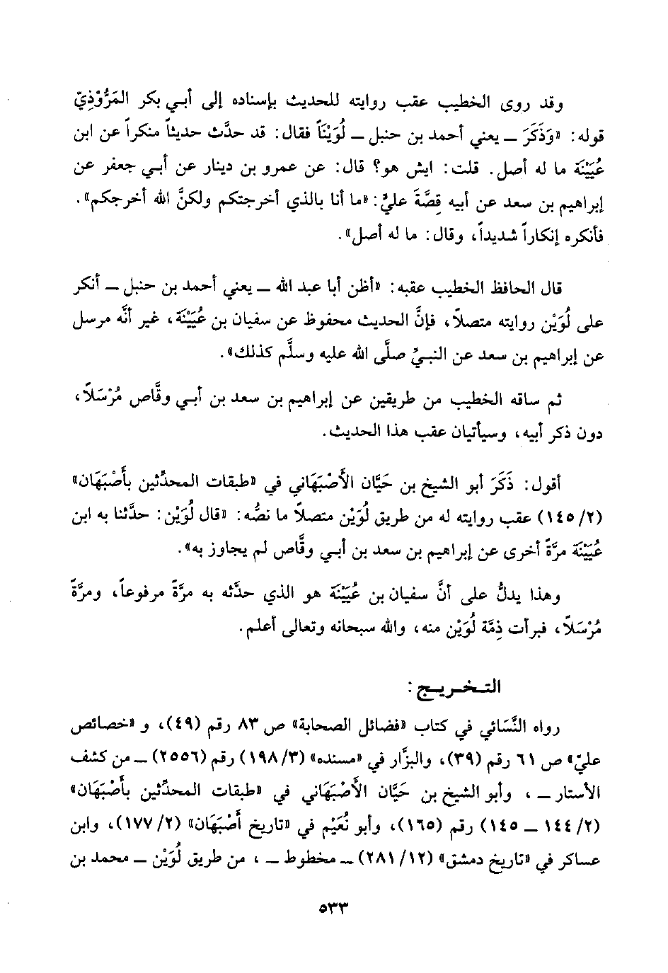 قال الحافظ الخطيب عقبه: "أظن أبا عبد اللَّه -يعني أحمد بن حنبل- أنكر على لُوَيْن روايته متصلًا، فإنَّ الحديث محفوظ عن سفيان بن عُيَيْنَة، غير أنَّه مرسل عن إبراهيم بن سعد عن النبيِّ صلَّى اللَّه عليه وسلَّم كذلك".