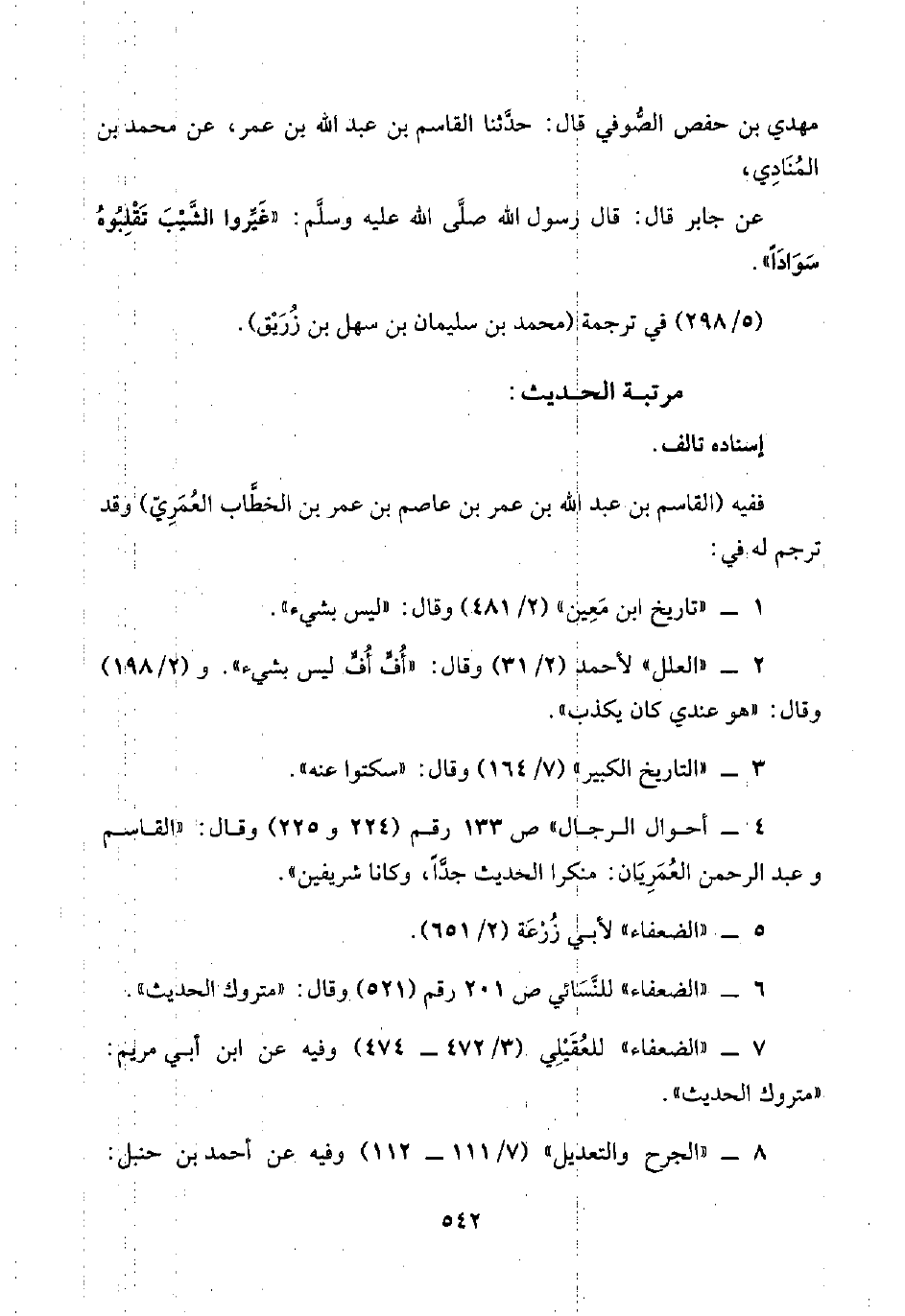 ٤ - "أحوال الرجال" ص ١٣٣ رقم (٢٢٤ و ٢٢٥) وقال: "القاسم وعبد الرحمن العُمَرِيَان: منكرا الحديث جدًّا، وكانا شريفين".