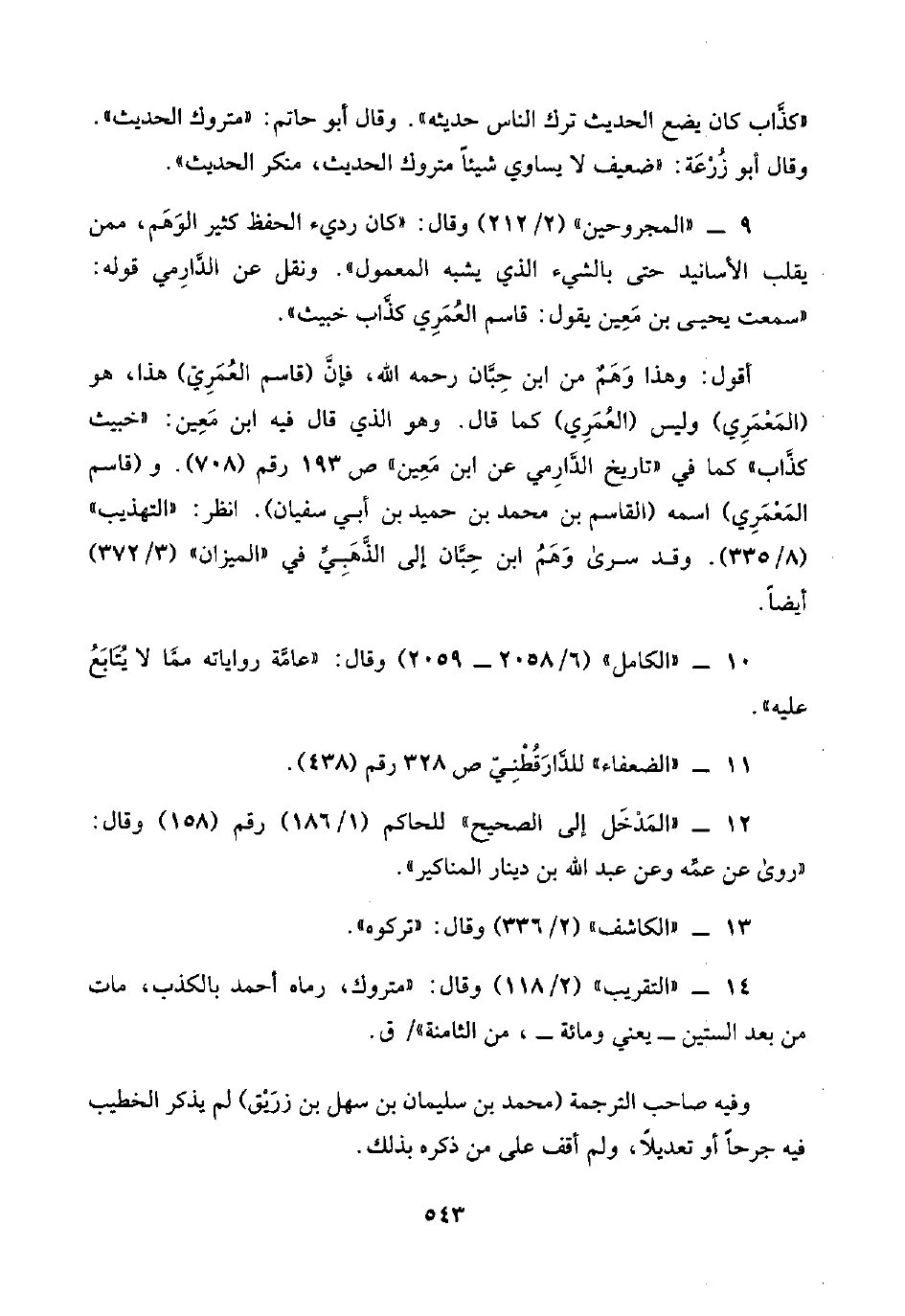 ٩ - "المجروحين" (٢/ ٢١٢) وقال: "كان رديء الحفظ كثير الوَهَم، ممن يقلب الأسانيد حتى بالشيء الذي يشبه المعمول". ونقل عن الدَّارِمي قوله: "سمعت يحيى بن مَعِين يقول: قاسم العُمَرِي كذَّاب خبيث".