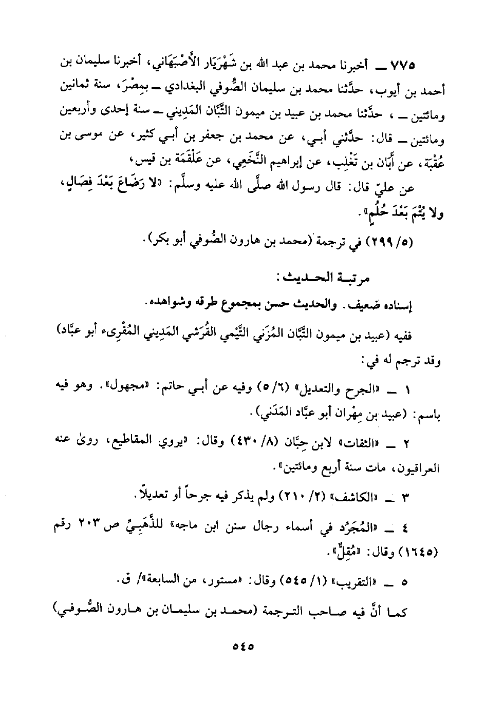 ٧٧٥ - أخبرنا محمد بن عبد اللَّه بن شَهْرَيَار الأَصْبَهَاني، أخبرنا سليمان بن أحمد بن أيوب، حدَّثنا محمد بن سليمان الصُّوفي البغدادي -بمِصْرَ، سنة ثمانين ومائتين-، حدَّثنا محمد بن عبيد بن ميمون التَّبَّان المَدِيني -سنة إحدى وأربعين ومائتين- قال: حدَّثني أبي، عن محمد بن جعفر بن أبي كثير، عن موسى بن عُقْبَة، عن أَبَان بن تَغْلِب، عن إبراهيم النَّخَعِي، عن عَلْقَمَة بن قيس،