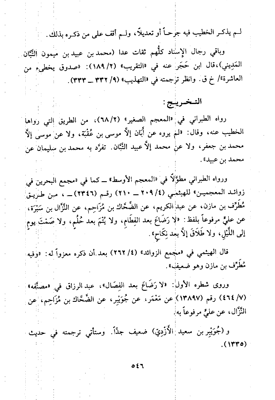 ورواه الطبراني مطوَّلًا في "المعجم الأوسط" -كما في "مجمع البحرين في زوائد المعجمين" للهيثمي (٤/ ٢٠٩ - ٢١٠) رقم (٢٣٤٦) -، من طريق مُطَرِّف بن مازن، عن عبد الكريم، عن الضَّحَّاك بن مُزَاحِم، عن النَّزَّال بن سَبْرَة، عن عليٍّ مرفوعًا بلفظ: "لا رَضَاعَ بعد الفِطَامِ، ولا يُتْمَ بعد حُلُمٍ، ولا صْمْتَ يومٍ إلى اللَّيْلِ، ولا طَلَاقَ إلَّا بعد نِكَاحٍ".