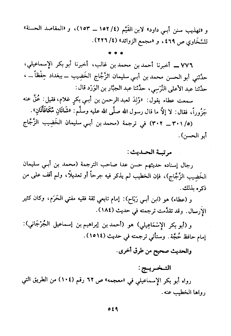 ٧٧٦ - أخبرنا أحمد بن محمد بن غالب، أخبرنا أبو بكر الإِسماعيلي، حدَّثني أبو الحسن محمد بن أبي سليمان الزَّجَّاج الخَضِيب -ببغداد حِفْظًا-، حدَّثنا عبد الأعلى النَّرْسِي، حدَّثنا عبد الجبَّار بن الوَرْد قال: