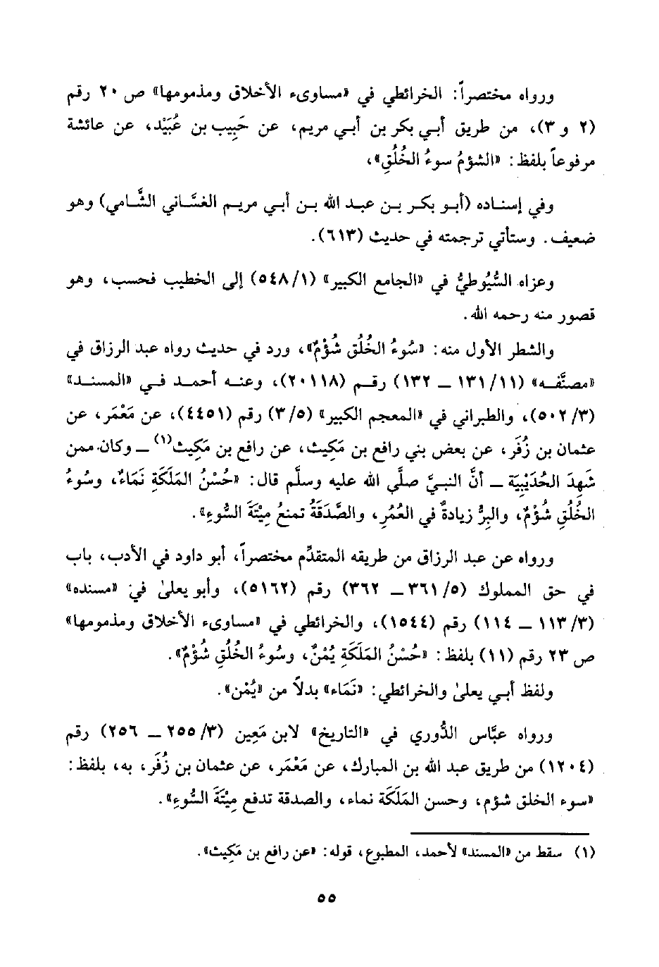 ورواه مختصرًا: الخرائطي في "مساوئ الأخلاق ومذمومها" ص ٢٠ رقم (٢ و ٣)، من طريق أبي بكر بن أبي مريم، عن حَبِيب بن عُبَيْد، عن عائشة مرفوعًا بلفظ: "الشؤمُ سوءُ الخُلُقِ"،