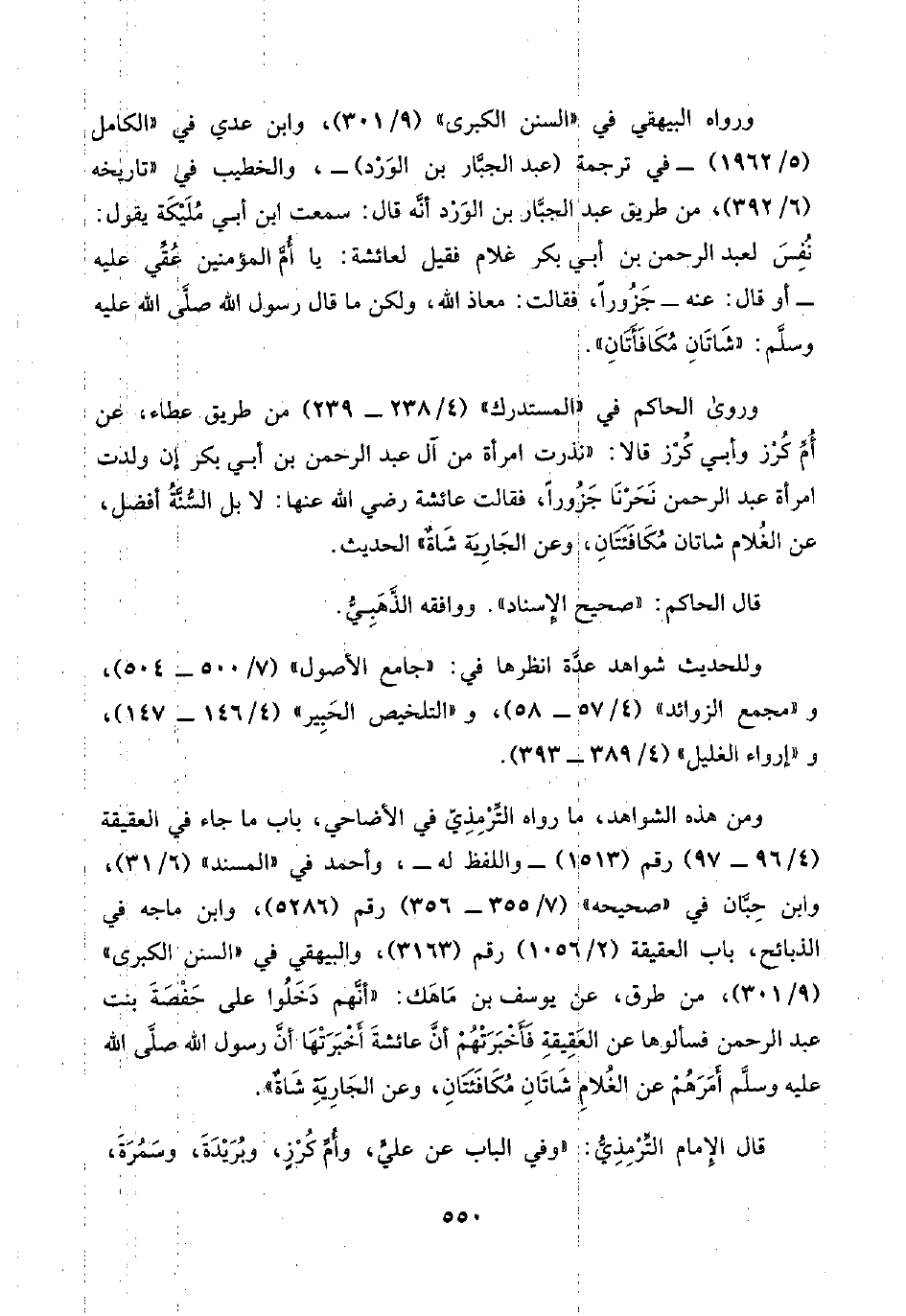 ورواه البيهقي في "السنن الكبرى" (٩/ ٣٠١)، وابن عدي في "الكامل (٥/ ١٩٦٢) -في ترجمة (عبد الجبَّار بن الوَرْد) -، والخطيب في "تاريخه (٦/ ٣٩٢)، من طريق عبد الجبَّار بن الوَرْد أنَّه قال: سمعت ابن أبي مُلَيْكَة يقول: نُفِسَ لعبد الرحمن بن أبي بكر غلام فقيل لعائشة: يا أُمَّ المؤمنين عُقِّي عليه -أو قال: عنه- جَزُورًا، فقالت: معاذ اللَّه، ولكن ما قال رسول اللَّه صلَّى اللَّه عليه وسلَّم: "شَاتَانِ مُكَافَأَتَانِ".