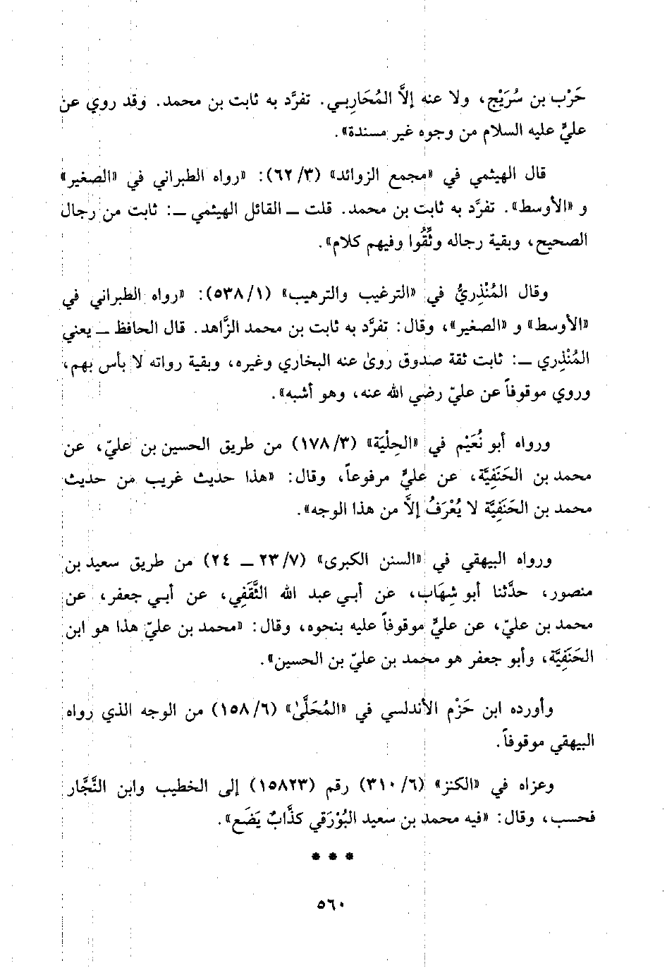 حَرْب بن سُرَيْج، ولا عنه إلَّا المُحَارِبي. تفرَّد به ثابت بن محمد. وقد روي عن عليٍّ عليه السلام من وجوه غير مسندة".