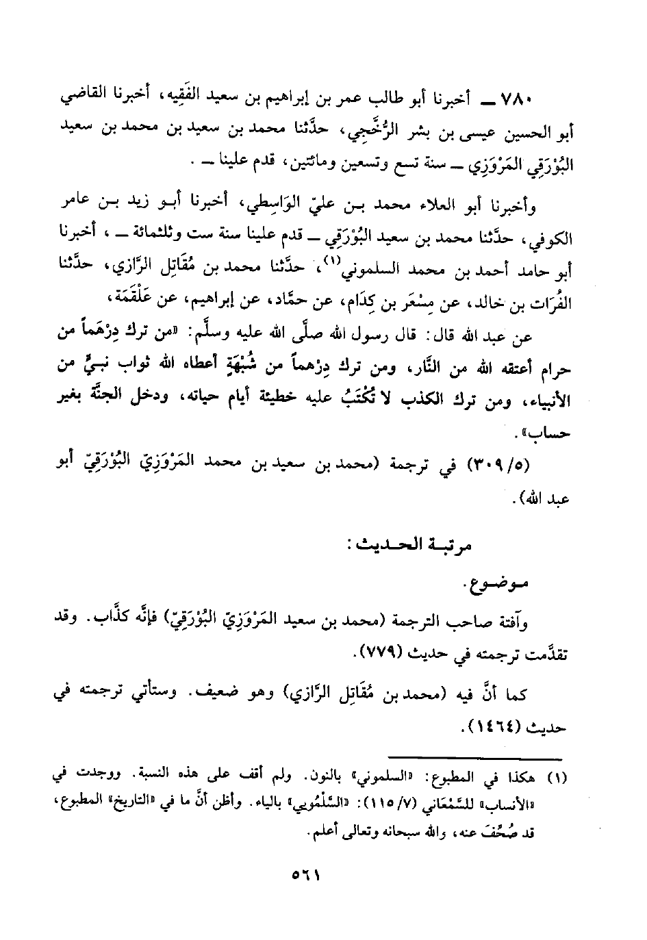 ٧٨٠ - أخبرنا أبو طالب عمر بن إبراهيم بن سعيد الفَقِيه، أخبرنا القاضي أبو الحسين عيسى بن بشر الرُّخَّجِي، حدَّثنا محمد بن سعيد بن محمد بن سعيد البُوْرَقِي المَرْوَزِي -سنة تسع وتسعين ومائتين، قدم علينا-.