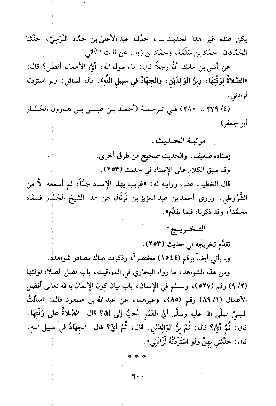 عن أنس بن مالك أنَّ رجلًا قال: يا رسول اللَّه، أيُّ الأعمال أفضل؟ قال: "الصَّلاةُ لِوَقْتِهَا، وبِرُّ الوَالِدَيْنِ، والجِهَادُ في سبيلِ اللَّه". قال السائل: ولو استزدته لزادني.