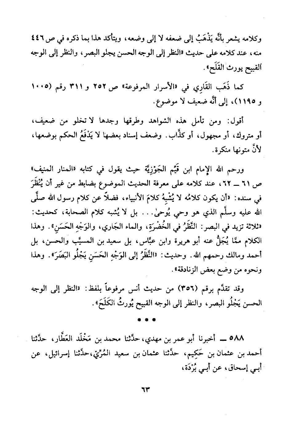 ورحم اللَّه الإِمام ابن قَيِّم الجَوْزِيَّة حيث يقول في كتابه "المنار المنيف" ص ٦١ - ٦٢، عند كلامه على معرفة الحديث الموضوع بضابط من غير أن يُنْظَرَ في سنده: "أن يكون كلامُه لا يُشْبِهُ كلامَ الأنبياء، فضلًا عن كلام رسول اللَّه صلَّى اللَّه عليه وسلَّم الذي هو وحي يُوحى. . . بل لا يُشبه كلام الصحابة، كحديث: "ثلاثة تزيد في البصر: النَّظَرُ في الخُضْرَةِ، والماء الجَاري، والوَجْهِ الحَسَنِ". وهذا الكلام ممَّا يُجَلُّ عنه أبو هريرة وابن عبَّاس، بل سعيد بن المسيَّب والحسن، بل أحمد ومالك رحمهم اللَّه. وحديث: "النَّظَرُ إلى الوَجْهِ الحَسَنِ يَجْلُو البَصَرَ". وهذا ونحوه من وضع بعض الزنادقة".