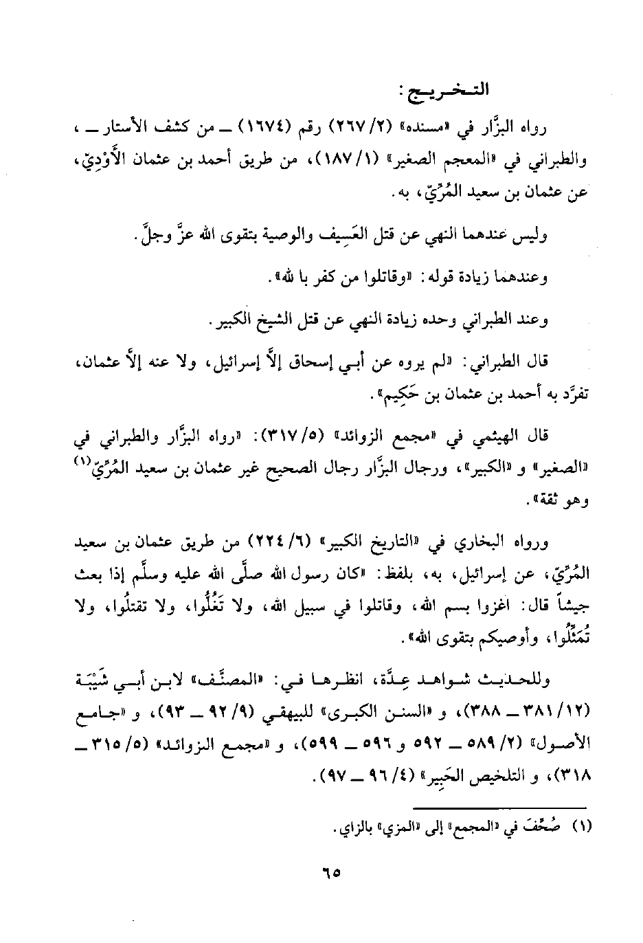 قال الهيثمي في "مجمع الزوائد" (٥/ ٣١٧): "رواه البزَّار والطبراني في "الصغير" و"الكبير"، ورجال البزَّار رجال الصحيح غير عثمان بن سعيد المُرِّيّ (¬١) وهو ثقة".