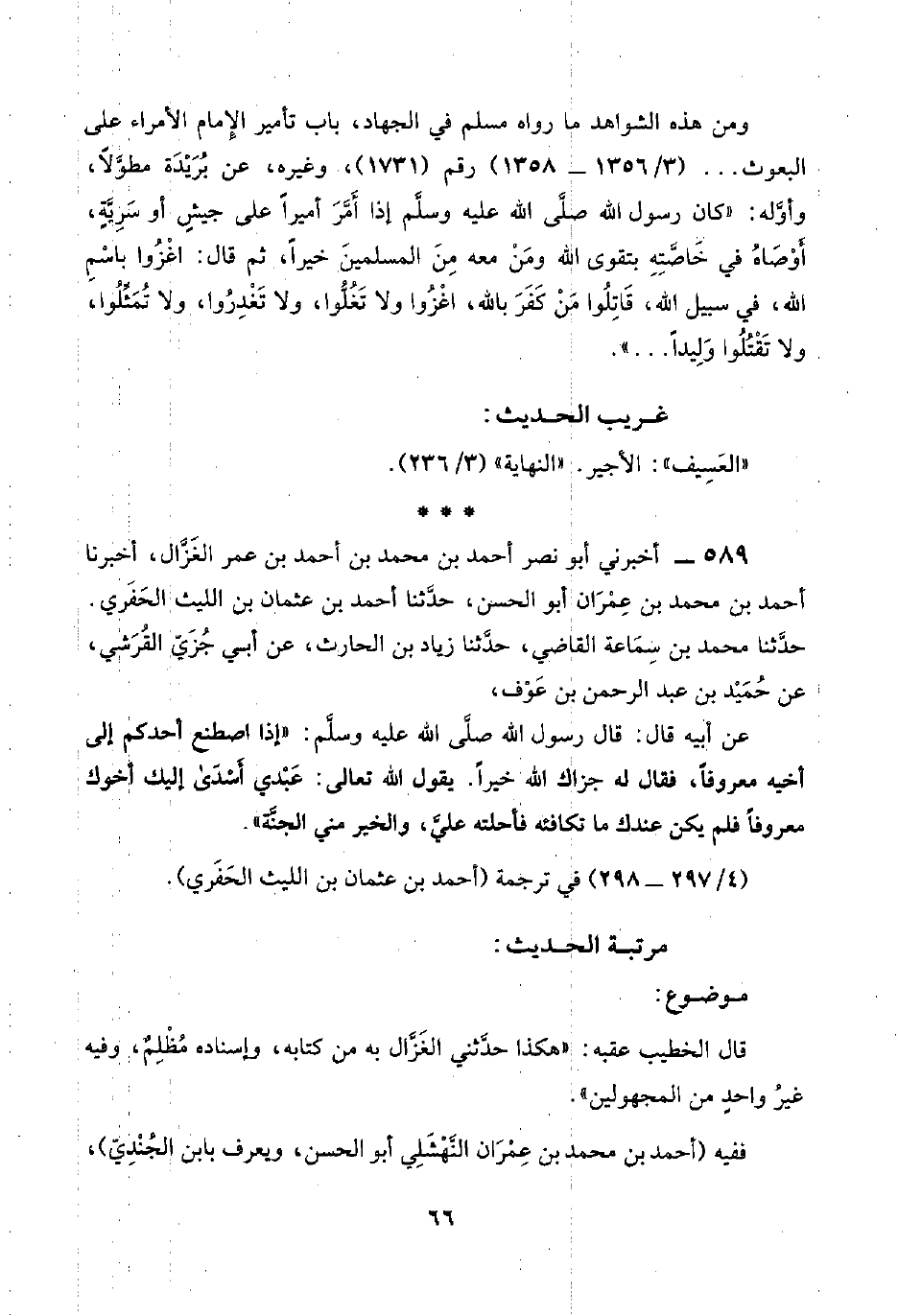 ٥٨٩ - أخبرني أبو نصر أحمد بن محمد بن أحمد بن عمر الغَزَّال، أخبرنا أحمد بن محمد بن عِمْرَان أبو الحسن، حدَّثنا أحمد بن عثمان بن الليث الحَفَري. حدَّثنا محمد بن سِمَاعة القاضي، حدَّثنا زياد بن الحارث، عن أبي جُزَيّ القُرَشي، عن حُمَيْد بن عبد الرحمن بن عَوْف،