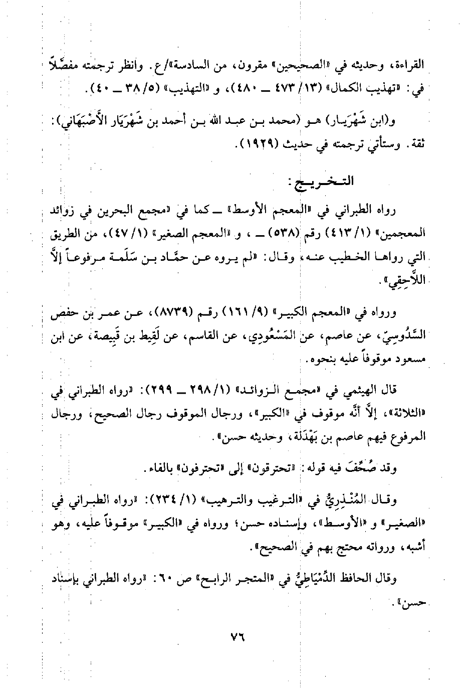قال الهيثمي في "مجمع الزوائد" (١/ ٢٩٨ - ٢٩٩): "رواه الطبراني في "الثلاثة"، إلَّا أنَّه موقوف في "الكبير"، ورجال الموقوف رجال الصحيح، ورجال المرفوع فيهم عاصم بن بَهْدَلة، وحديثه حسن".