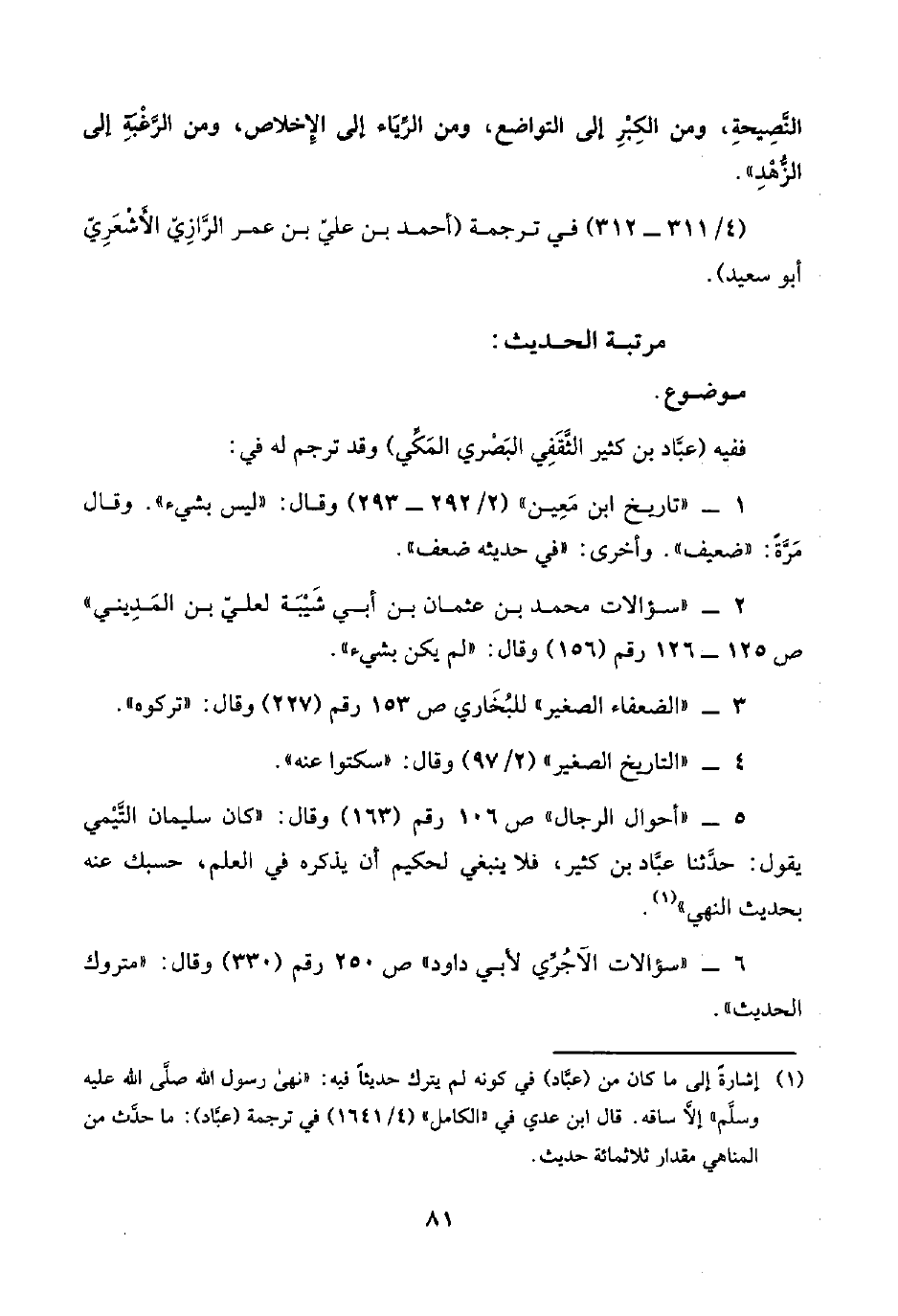 ٥ - "أحوال الرجال" ص ١٠٦ رقم (١٦٣) وقال: "كان سليمان التَّيْمي يقول: حدَّثنا عبَّاد بن كثير، فلا ينبغي لحكيم أن يذكره في العلم، حسبك عنه بحديث النهي" (¬١).