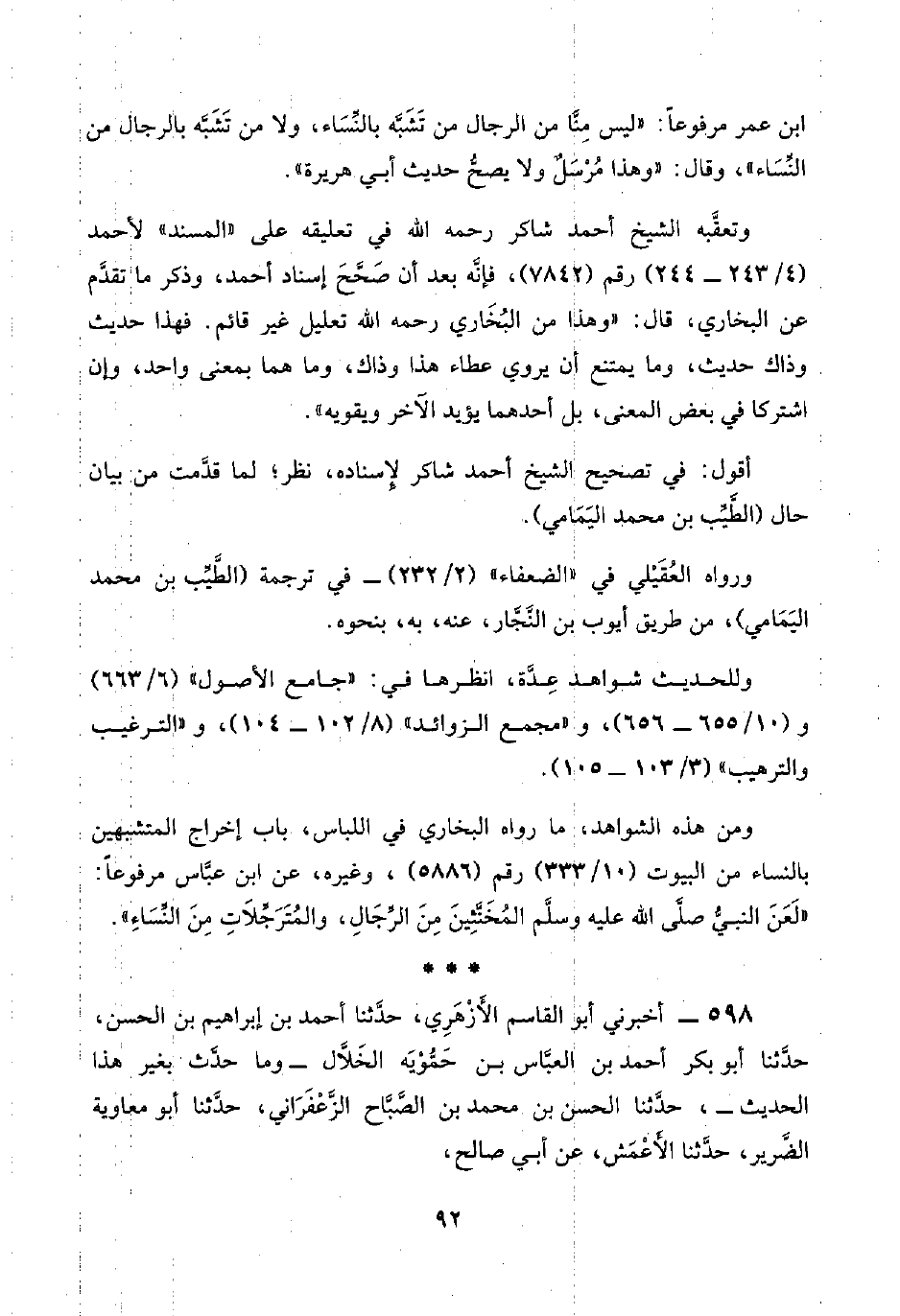 ابن عمر مرفوعًا: "ليس مِنَّا من الرجال من تَشَبَّه بالنِّسَاء، ولا من تَشَبَّه بالرجال من النِّسَاء"، وقال: "وهذا مُرْسَلٌ ولا يصحُّ حديث أبي هريرة".