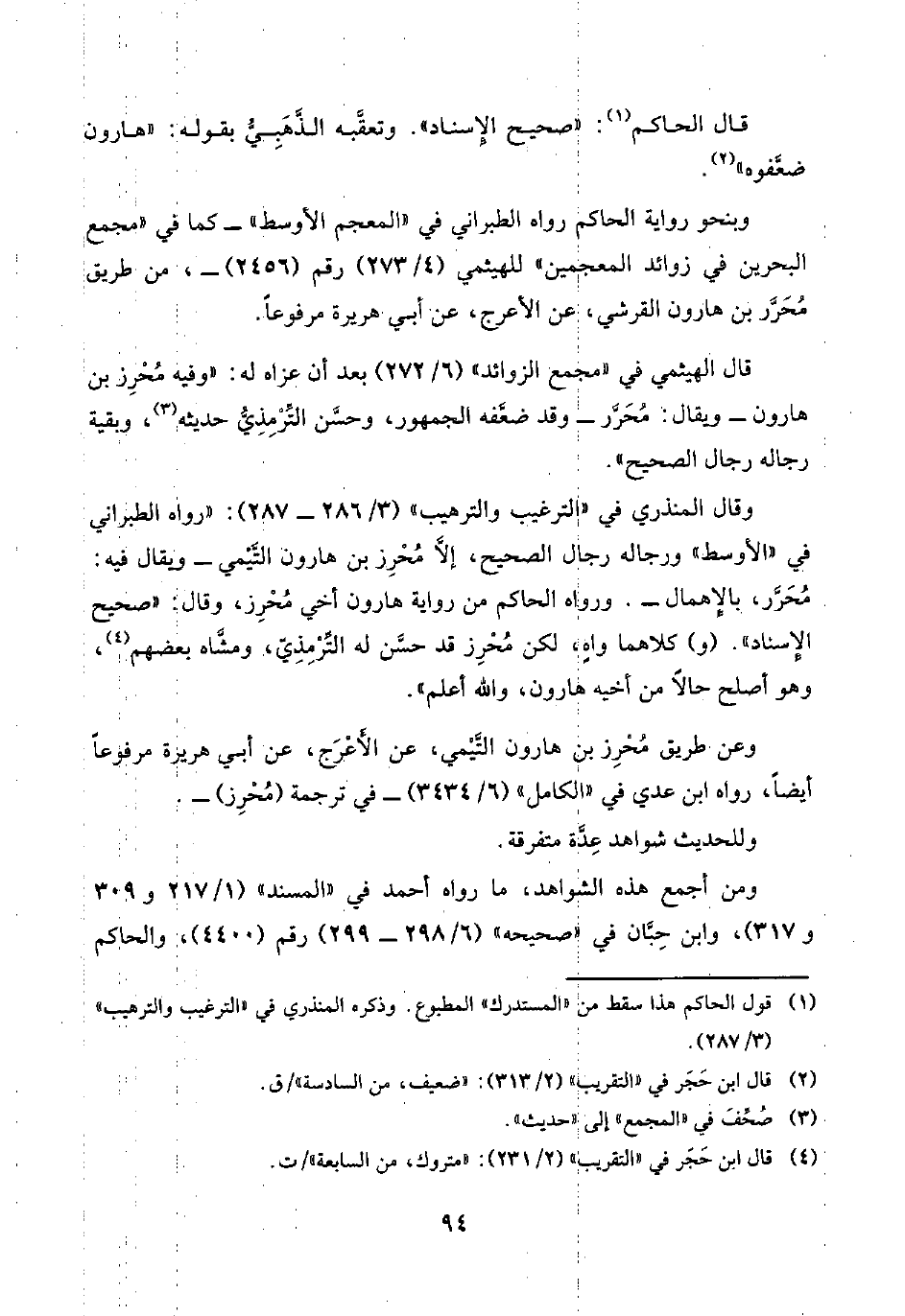 وقال المنذري في "الترغيب والترهيب" (٣/ ٢٨٦ - ٢٨٧): "رواه الطبراني في "الأوسط" ورجاله رجال الصحيح، إلَّا مُحْرِز بن هارون التَّيْمي -ويقال فيه: مُحَرَّر، بالإِهمال-. ورواه الحاكم من رواية هارون أخي مُحْرِز، وقال: "صحيح الإِسناد". (و) كلاهما واهٍ، لكن مُحْرِز قد حسَّن له التِّرْمِذِيّ، ومشَّاه بعضهم (¬٤)، وهو أصلح حالًا من أخيه هارون، واللَّه أعلم".
