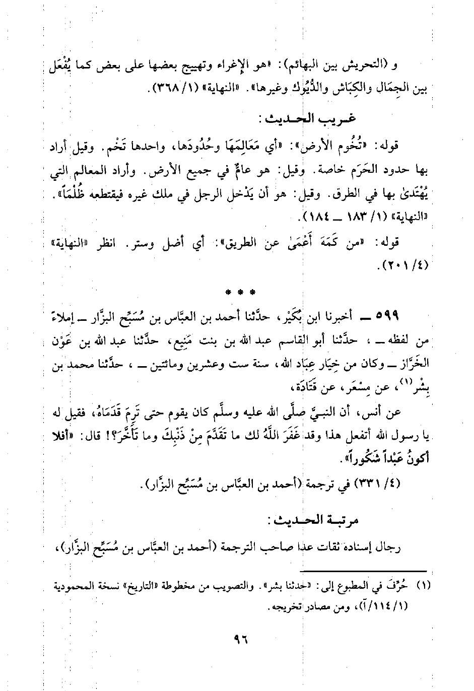 ٥٩٩ - أخبرنا ابن بُكَيْر، حدَّثنا أحمد بن العبَّاس بن مُسَبِّح البزَّار -إملاءً من لفظه-، حدَّثنا أبو القاسم عبد اللَّه بن بنت مَنِيع، حدَّثنا عبد اللَّه بن عَوْن الخَرَّاز -وكان من خِيَار عِبَاد اللَّه، سنة ست وعشرين ومائتين-، حدَّثنا محمد بن بِشْر (¬١)، عن مِسْعَر، عن قَتَادَة،