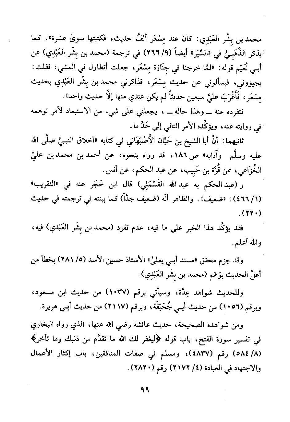 محمد بن بِشْر العَبْدِي: كان عند مِسْعَر ألفُ حديث، فكتبتها سوى عشرة". كما يذكر الذَّهَبِيُّ في "السِّيَر" أيضًا (٩/ ٢٦٦) في ترجمة (محمد بن بِشْر العَبْدِي) عن أبي نُعَيْم قوله: "لمَّا خرجنا في جِنَازة مِسْعَر، جعلت أتطاول في المشي، فقلت: يجيؤوني، فيسألوني عن حديث مِسْعَر، فذاكرني محمد بن بِشْر العَبْدِي بحديث مِسْعَر، فَأَغْرَبَ عليَّ سبعين حديثًا لم يكن عندي منها إلَّا حديث واحد".