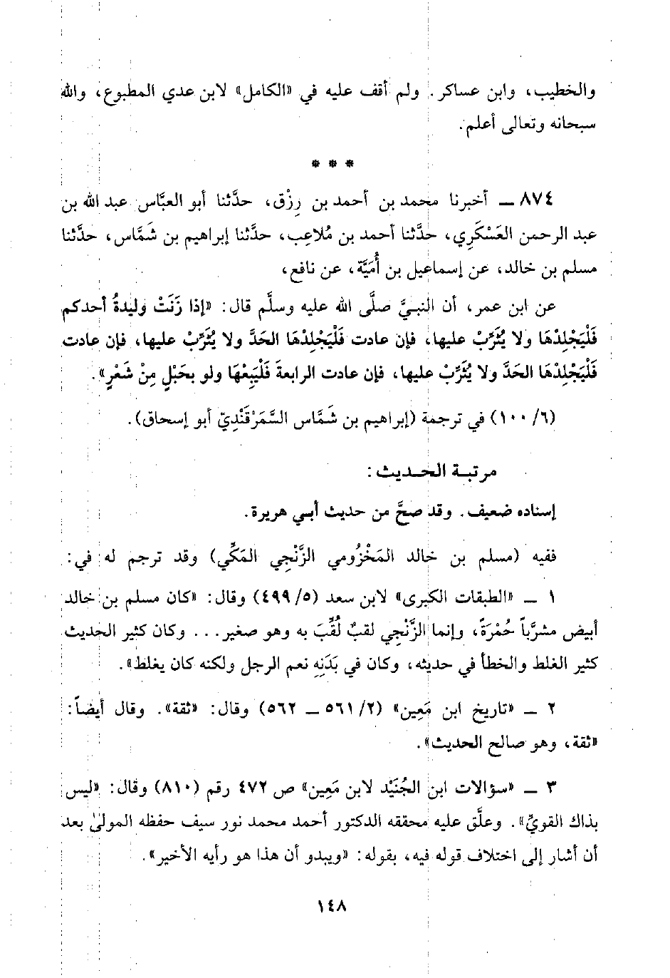 ٨٧٤ - أخبرنا محمد بن أحمد بن رِزْق، حدَّثنا أبو العبَّاس، عبد اللَّه بن عبد الرحمن العَسْكَرِي، حدَّثنا أحمد بن مُلاعِب، حدَّثنا إبراهيم بن شَمَّاس، حدَّثنا مسلم بن خالد، عن إسماعيل بن أُمَيَّة، عن نافع،