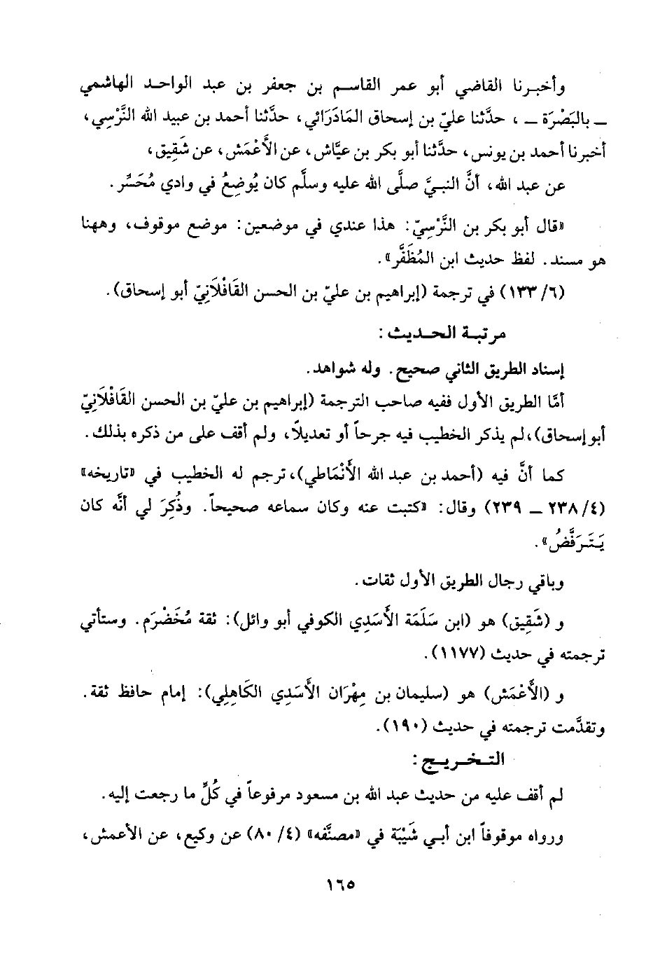 وأخبرنا القاضي أبو عمر القاسم بن جعفر بن عبد الواحد الهاشمي -بالبَصْرَة-، حدَّثنا عليّ بن إسحاق المَادَرَائي، حدَّثنا أحمد بن عبيد اللَّه النَّرْسِي، أخبرنا أحمد بن يونس، حدَّثنا أبو بكر بن عيَّاش، عن الأَعْمَش، عن شَقِيق،