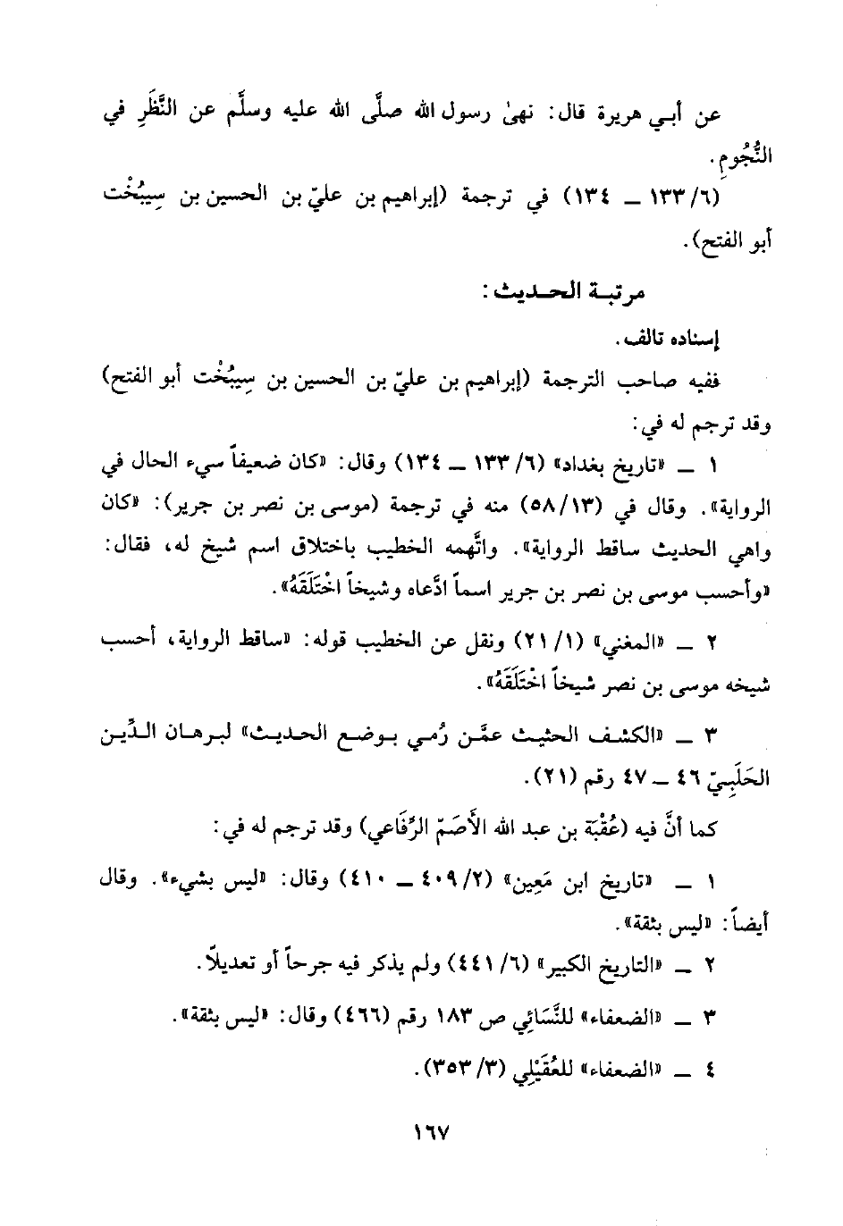 ١ - "تاريخ بغداد" (٦/ ١٣٣ - ١٣٤) وقال: "كان ضعيفًا سيء الحال في الرواية". وقال في (١٣/ ٥٨) منه في ترجمة (موسى بن نصر بن جرير): "كان واهي الحديث ساقط الرواية". واتَّهمه الخطيب باختلاق اسم شيخ له، فقال: "وأحسب موسى بن نصر بن جرير اسمًا ادَّعاه وشيخًا اخْتَلَقَهُ".