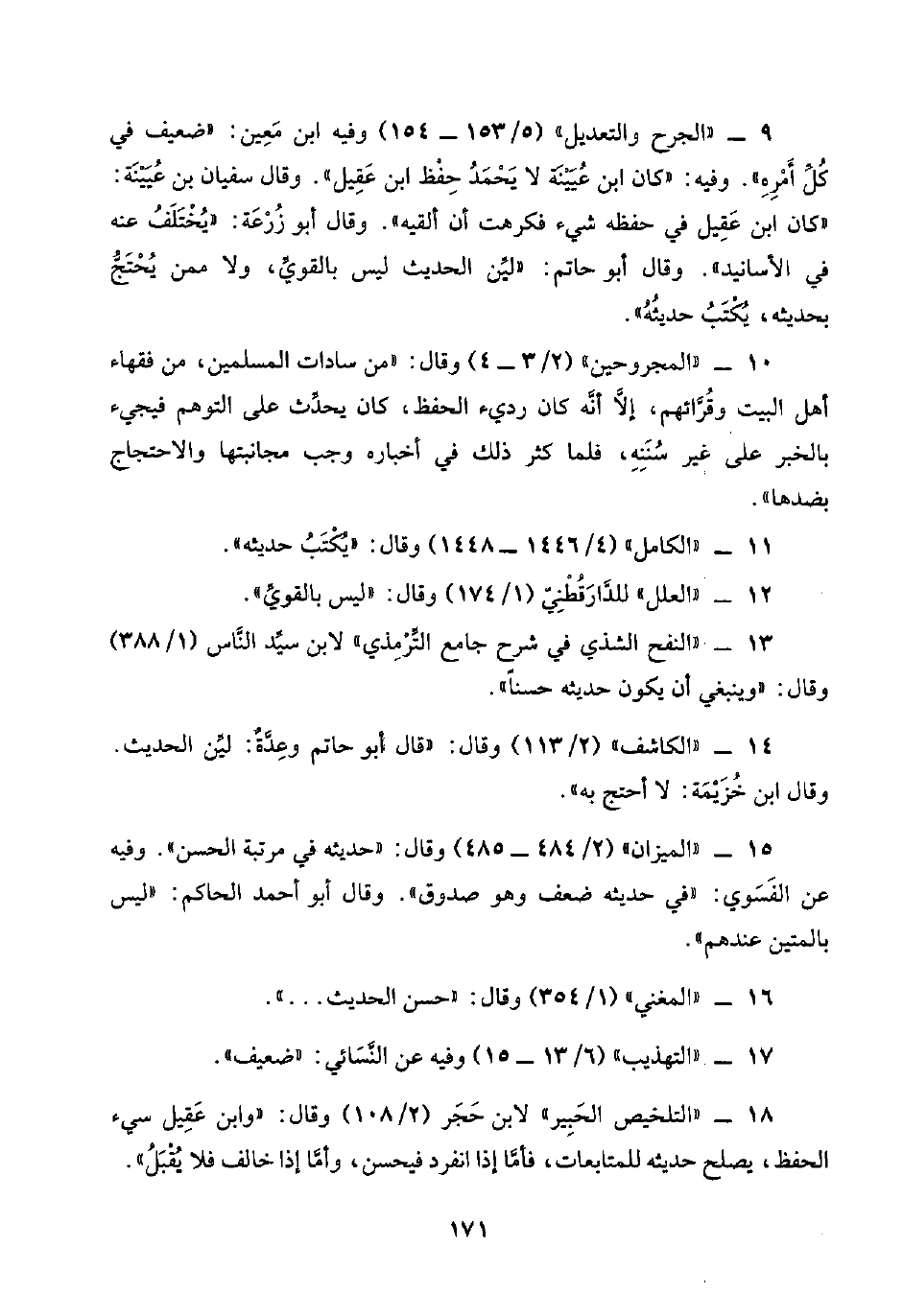 ٩ - "الجرح والتعديل" (٥/ ١٥٣ - ١٥٤) وفيه ابن مَعِين: "ضعيف في كُلِّ أَمْرِهِ". وفيه: "كان ابن عُيَيْنَة لا يَحْمَدُ حِفْظ ابن عَقِيل". وقال سفيان بن عُيَيْنَة: "كان ابن عَقِيل في حفظه شيء فكرهت أن ألقيه". وقال أبو زُرْعَة: "يُخْتَلَفُ عنه في الأسانيد". وقال أبو حاتم: "ليِّن الحديث ليس بالقويِّ، ولا ممن يُحْتَجُّ بحديثه، يُكْتَبُ حَديثُهُ".