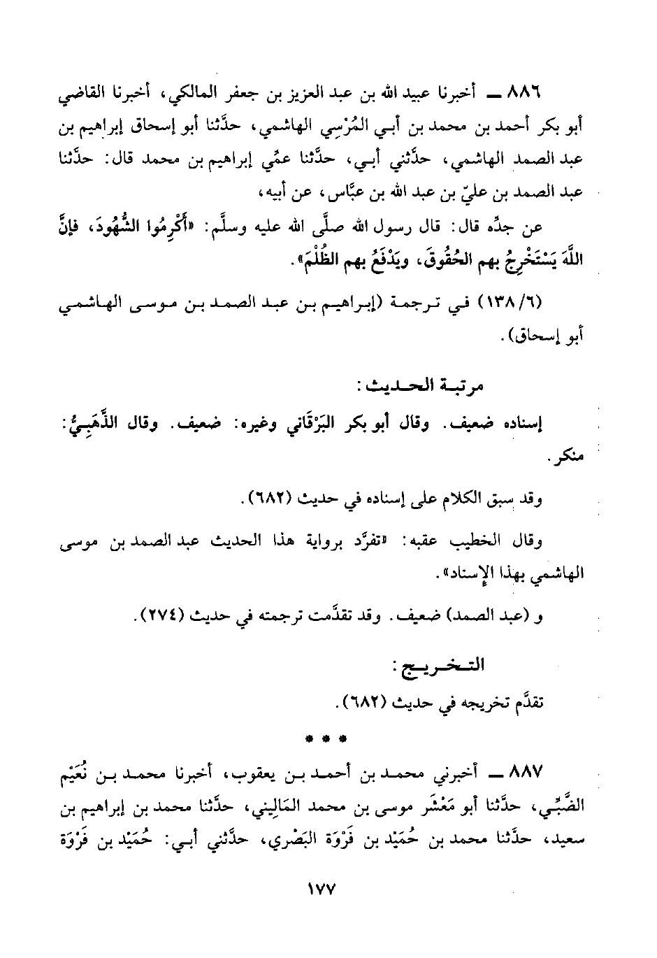 ٨٨٦ - أخبرنا عبيد اللَّه بن عبد العزيز بن جعفر المالكي، أخبرنا القاضي أبو بكر أحمد بن محمد بن أبي المُرْسِي الهاشمي، حدَّثنا أبو إسحاق إبراهيم بن عبد الصمد الهاشمي، حدَّثني أبي، حدَّثنا عمِّي إبراهيم بن محمد قال: حدَّثنا عبد الصمد بن عليّ بن عبد اللَّه بن عبَّاس، عن أبيه،