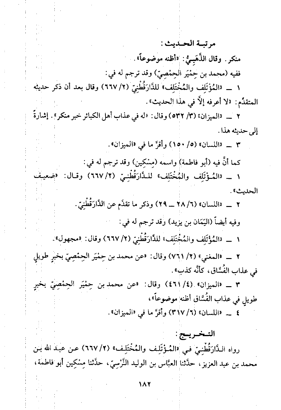 ٢ - "المغني" (٢/ ٧٦١) وقال: "عن محمد بن حِمْيَر الحِمْصِيّ بخبرٍ طويلٍ في عذاب الفُسَّاق، كأنَّه كذب".