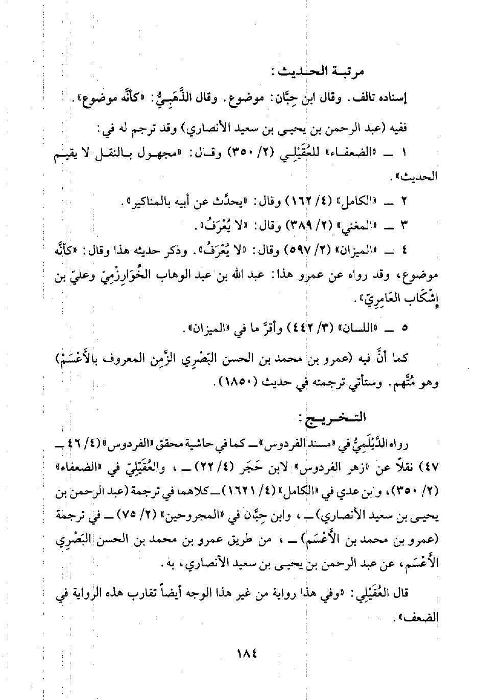 ٤ - "الميزان" (٢/ ٥٩٧) وقال: "لا يُعْرَفُ". وذكر حديثه هذا وقال: "كأنَّه موضوع، وقد رواه عن عمرو هذا: عبد اللَّه بن عبد الوهاب الخُوَارِزْمِيّ وعليّ بن إِشْكَاب العَامِرِيّ".