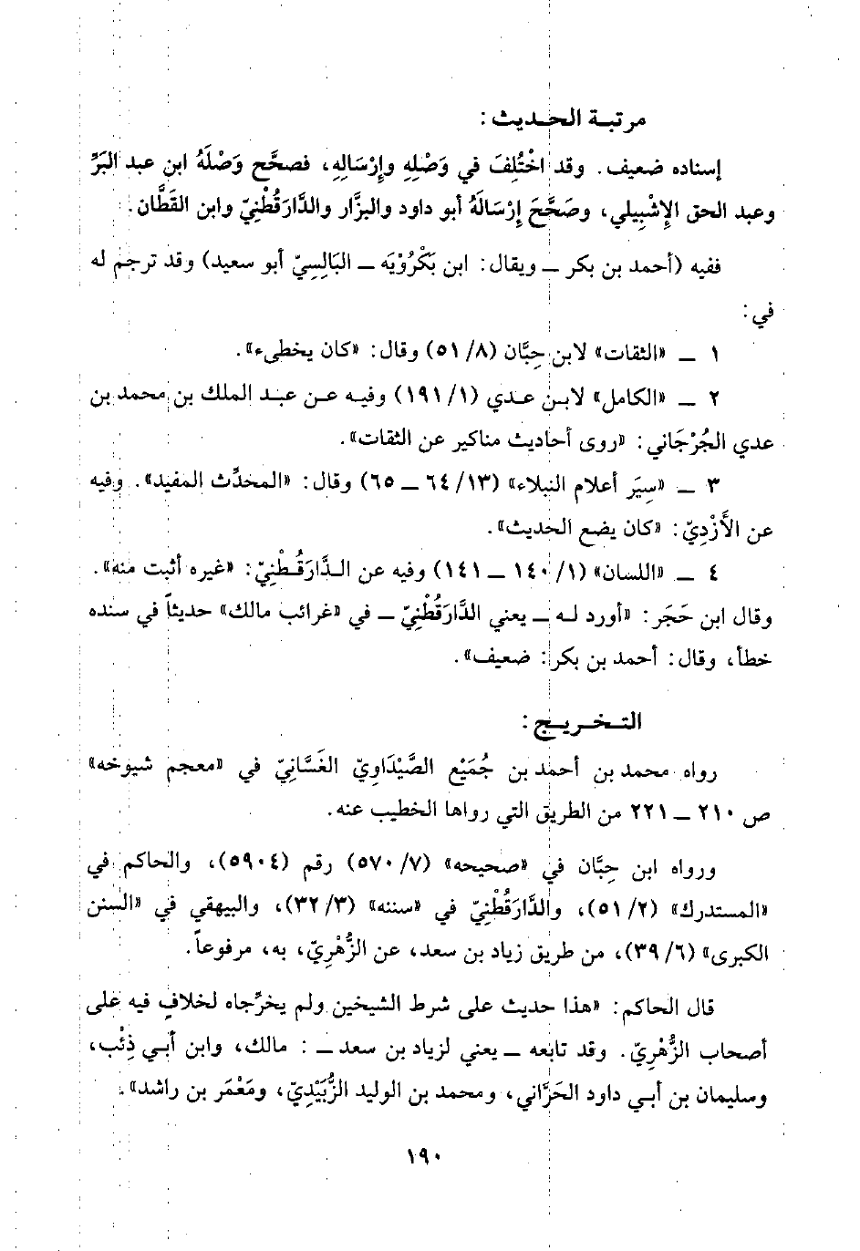٤ - "اللسان" (١/ ١٤٠ - ١٤١) وفيه عن الدَّارَقُطْنِيّ: "غيره أثبت منه". وقال ابن حَجَر: "أورد له -يعني الدَّارَقُطْنِيّ- في "غرائب مالك" حديثًا في سنده خطأ، وقال: أحمد بن بكر: ضعيف".