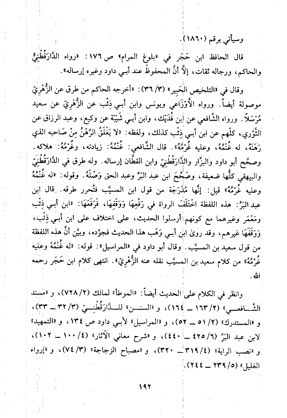 وقال في "التلخيص الحَبِير" (٣/ ٣٦): "أخرجه الحاكم من طرق عن الزُّهْرِيّ: موصولة أيضًا. ورواه الأَوْزَاعي ويونس وابن أبي ذِئْب عن الزُّهْرِيّ عن سعيد مُرْسَلًا. ورواه الشَّافعي عن ابن فُدَيْك، وابن أبي شَيْبَة عن وكيع، وعبد الرزاق عن الثَّوْري، كلّهم عن ابن أبي ذِئْب كذلك، ولفظه: "لا يَغْلَقُ الرَّهْنُ مَنْ صَاحبه الذي رَهَنَهُ، له غُنْمُهُ، وعليه غُرْمُهُ". قال الشَّافعي: غُنْمُهُ: زيادته، وغُرْمُهُ: هلاكه. وصحَّح أبو داود والبزَّار والدَّارَقُطْنِيّ وابن القطَّان إرساله. وله طرق في الدَّارَقُطْنِيّ والبيهقي كلُّها ضعيفة، وصَحَّحَ ابن عبد البَرِّ وعبد الحق وَصْلَهُ. وقوله: "له غُنْمُهُ وعليه غُرْمُهُ" قيل: إنَّها مُدْرَجَة من قول ابن المسيَّب فتُحرر طرقه. قال ابن عبد البَرِّ: هذه اللفظة اختلف الرواة في رَفْعِهَا وَوَقْفِهَا، فَرَفَعَهَا: "ابن أبي ذِئْب ومَعْمَر وغيرهما مع كونهم أرسلوا الحديث، على اختلاف على ابن أبي ذِئْب، وَوَقَفَهَا غيرهم، وقد روى ابن أبي وَهْب هذا الحديث فجوَّده، وبيَّن أنَّ هذه اللفظة من قول سعيد بن المسيَّب. وقال أبو داود في "المراسيل": قوله: "له غُنْمُهُ وعليه غُرْمُهُ" من كلام سعيد بن المسيَّب نقله عنه الزُّهْرِيّ". انتهى كلام ابن حَجَر رحمه اللَّه.