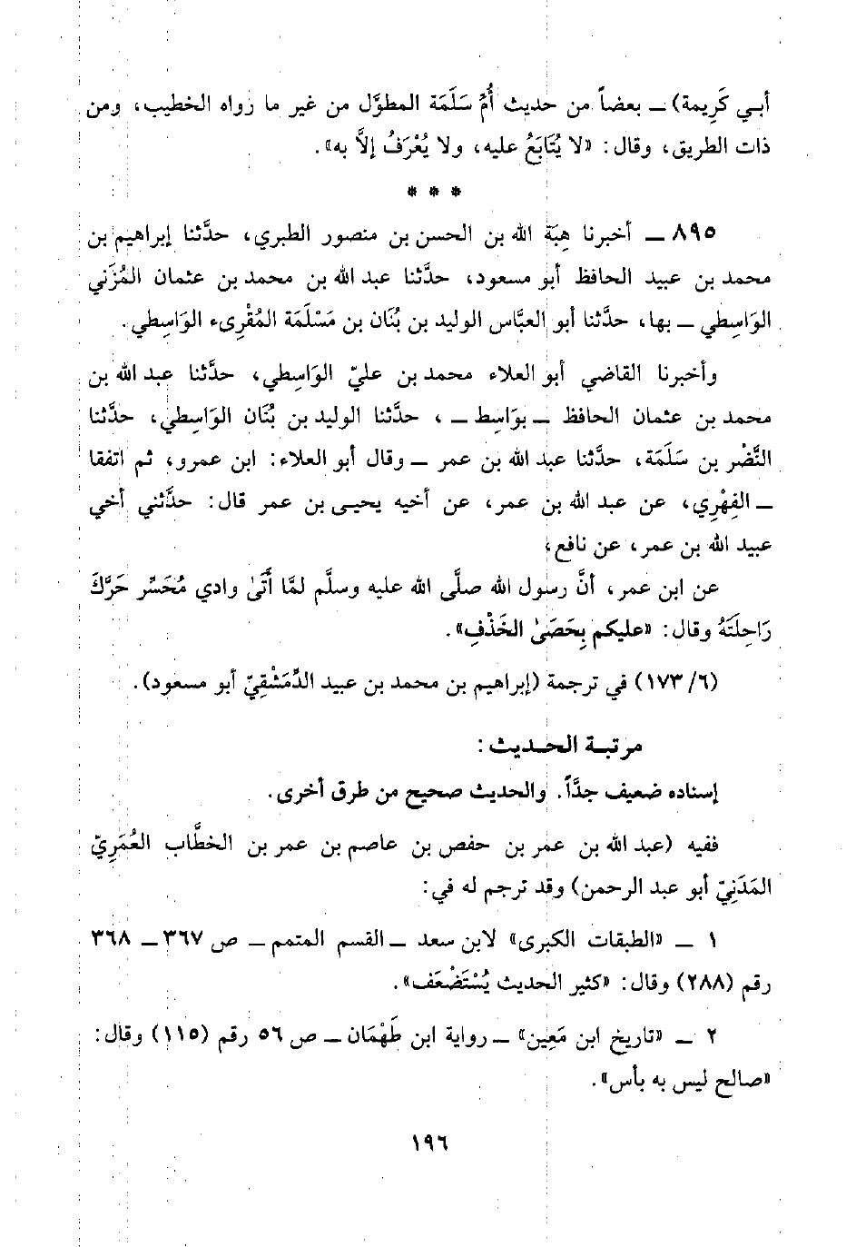 وأخبرنا القاضي أبو العلاء محمد بن عليّ الوَاسِطي، حدَّثنا عبد اللَّه بن محمد بن عثمان الحافظ -بوَاسِط-، حدَّثنا الوليد بن بُنَان الوَاسِطي، حدَّثنا النَّضْر بن سَلَمَة، حدَّثنا عبد اللَّه بن عمر -وقال أبو العلاء: ابن عمرو، ثم اتفقا- الفِهْرِي، عن عبد اللَّه بن عمر، عن أخيه يحيى بن عمر قال: حدَّثني أخي عبيد اللَّه بن عمر، عن نافع،