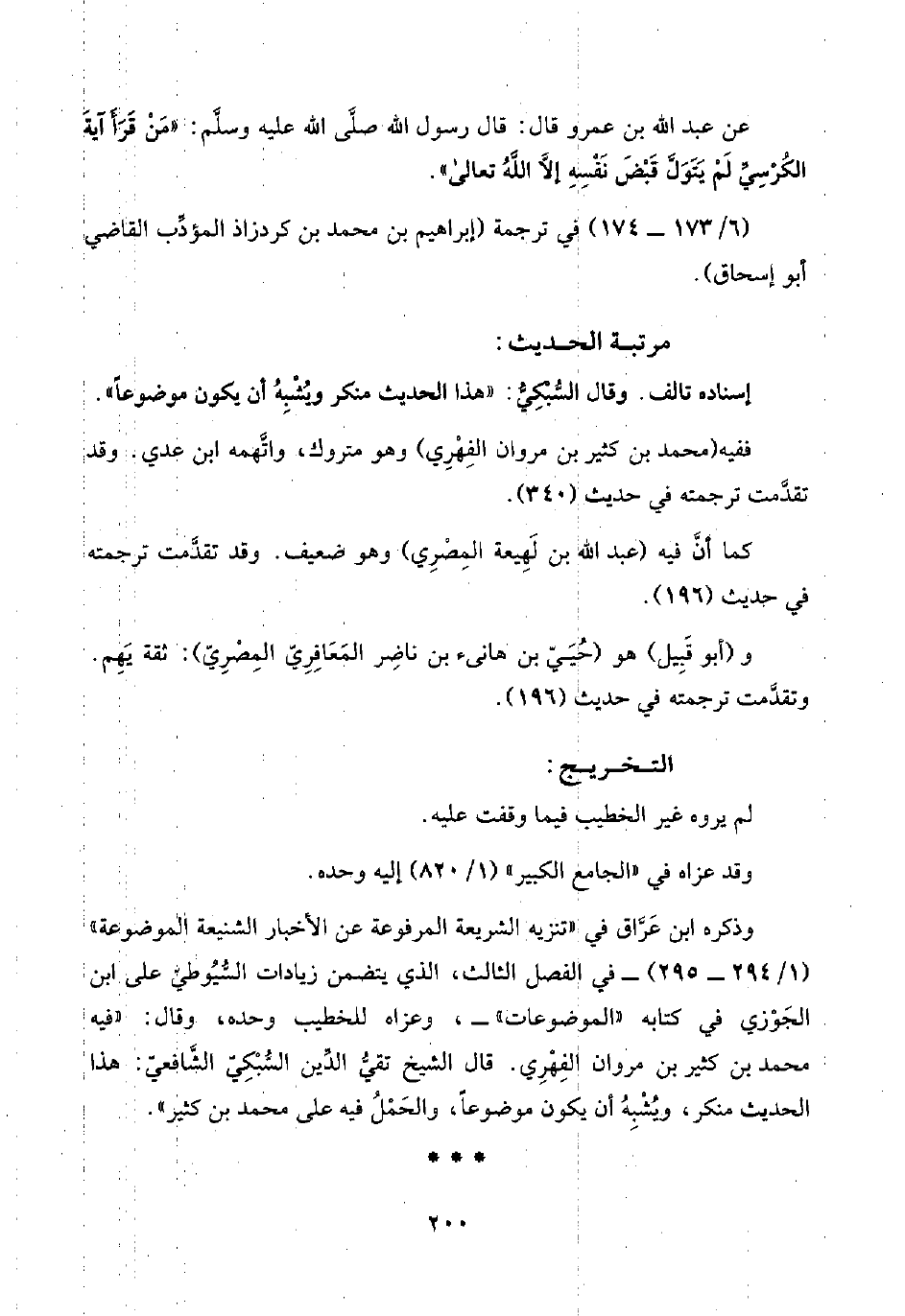 وذكره ابن عَرَّاق في "تنزيه الشريعة المرفوعة عن الأخبار الشنيعة الموضوعة" (١/ ٢٩٤ - ٢٩٥) -في الفصل الثالث، الذي يتضمن زيادات السُّيُوطيّ على ابن الجَوْزي في كتابه "الموضوعات"-، وعزاه للخطيب وحده، وقال: "فيه محمد بن كثير بن مروان الفِهْرِي. قال الشيخ تقيُّ الدِّين السُّبْكِيّ الشَّافِعِيّ: هذا الحديث منكر، ويُشْبِهُ أن يكون موضوعًا، والحَمْلُ فيه على محمد بن كثير".