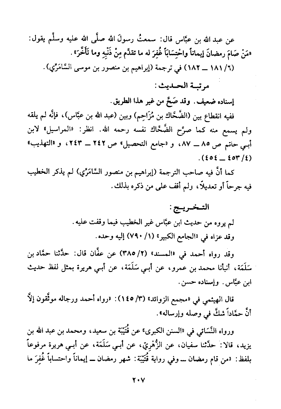 عن عبد اللَّه بن عبَّاس قال: سمعتُ رسول اللَّه صلَّى اللَّه عليه وسلَّم يقول: "مَنْ صَامَ رمضانَ إيمانًا واحْتِسَابًا غُفِرَ له ما تقدَّم مِنْ ذَنْبِهِ وما تَأَخَّرَ".