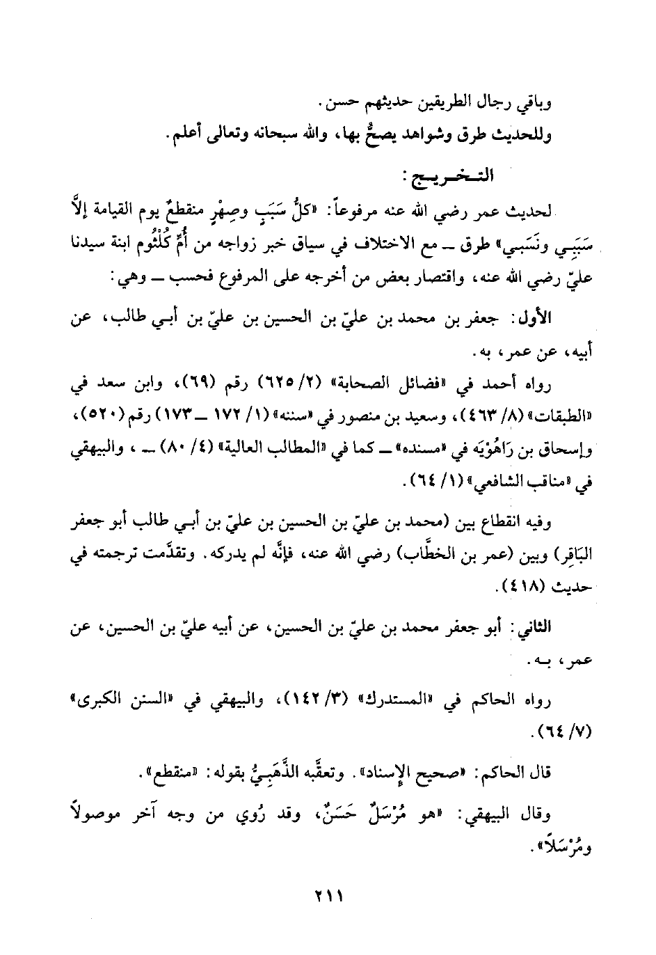 الحديث عمر رضي اللَّه عنه مرفوعًا: "كلُّ سَبَبٍ وصِهْرٍ منقطعٌ يوم القيامة إلَّا سَبَبِي ونَسَبي" طرق -مع الاختلاف في سياق خبر زواجه من أُمِّ كُلْثُوم ابنة سيدنا عليّ رضي اللَّه عنه، واقتصار بعض من أخرجه على المرفوع فحسب- وهي: