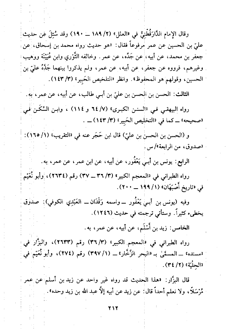 وقال الإِمام الدَّارَقُطْنِيُّ في "العلل" (٢/ ١٨٩ - ١٩٠) وقد سُئِلَ عن حديث عليّ بن الحسين عن عمر مرفوعًا فقال: "هو حديث رواه محمد بن إسحاق، عن جعفر بن محمد، عن أبيه، عن جَدِّه، عن عمر. وخالفه الثَّوْري وابن عُيَيْنَة ووهيب وغيرهم، فرووه عن جعفر، عن أبيه، عن عمر، ولم يذكروا بينهما جَدَّهُ عليّ بن الحسين، وقولهم هو المحفوظ"، وانظر "التلخيص الحَبِير" (٣/ ١٤٣).