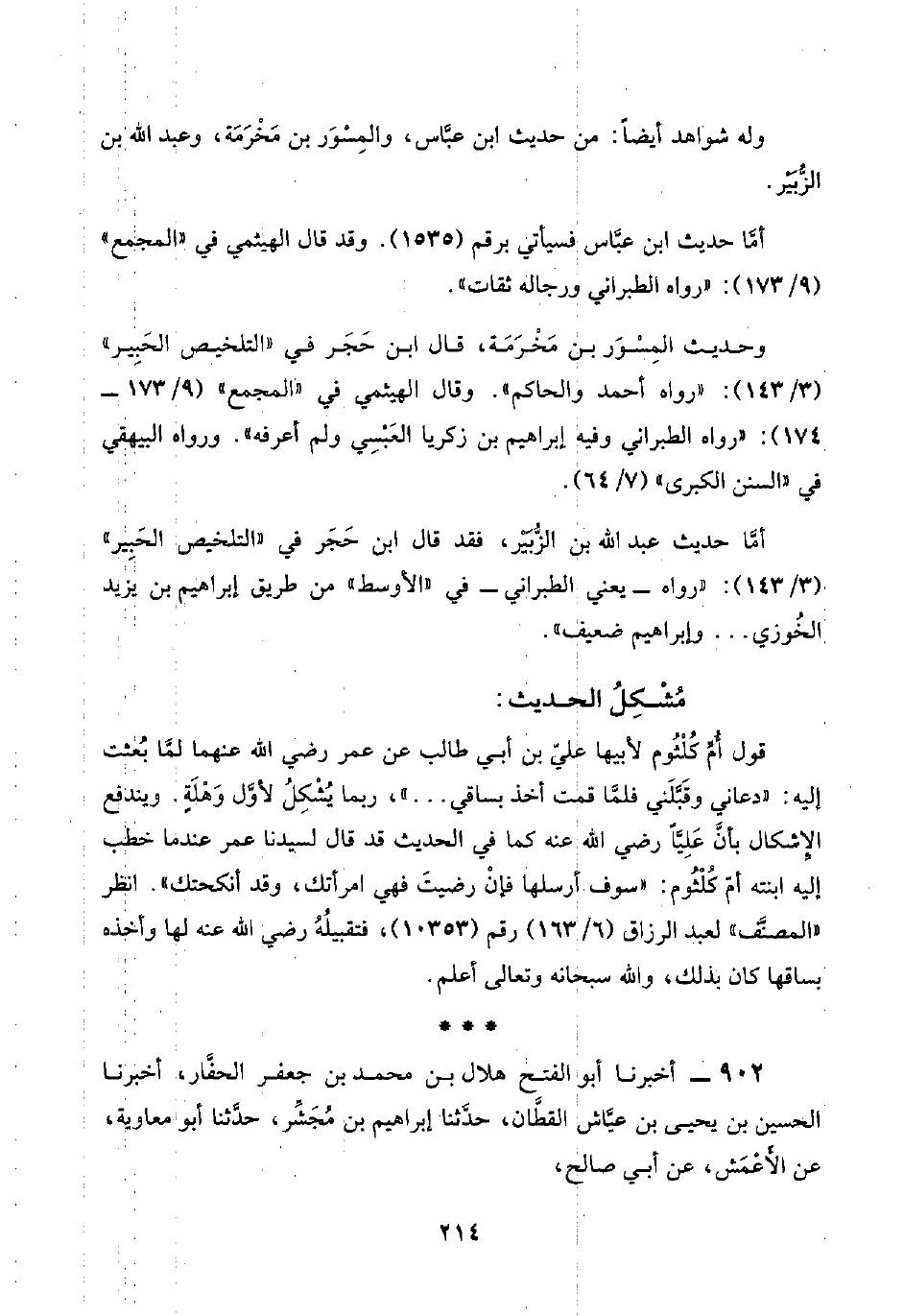 وحديث المِسْوَر بن مَخْرَمَة، قال ابن حَجَر في "التلخيص الحَبِير" (٣/ ١٤٣): "رواه أحمد والحاكم". وقال الهيثمي في "المجمع" (٩/ ١٧٣ - ١٧٤): "رواه الطبراني وفيه إبراهيم بن زكريا العَبْسِي ولم أعرفه". ورواه البيهقي في "السنن الكبرى" (٧/ ٦٤).