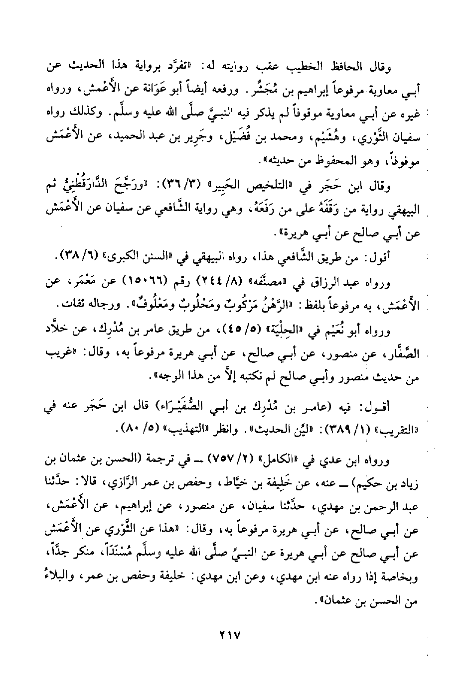 وقال ابن حَجَر في "التلخيص الحَبِير" (٣/ ٣٦): "ورَجَّحَ الدَّارَقُطْنِيُّ ثم البيهقي رواية من وَقَفَهُ على من رَفَعَهُ، وهي رواية الشَّافعي عن سفيان عن الأَعْمَش عن أبي صالح عن أبي هريرة".