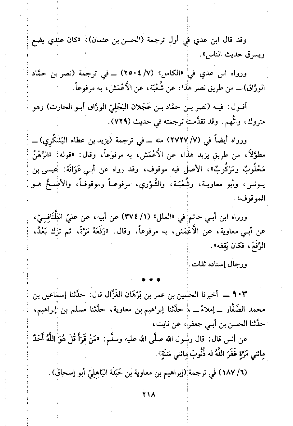 ٩٠٣ - أخبرنا الحسين بن عمر بن بَرْهَان الغَزَّال قال: حدَّثنا إسماعيل بن محمد الصَّفَّار -إملاءً-، حدَّثنا إبراهيم بن معاوية، حدَّثنا مسلم بن إبراهيم، حدَّثنا الحسن بن أبي جعفر، عن ثابت،