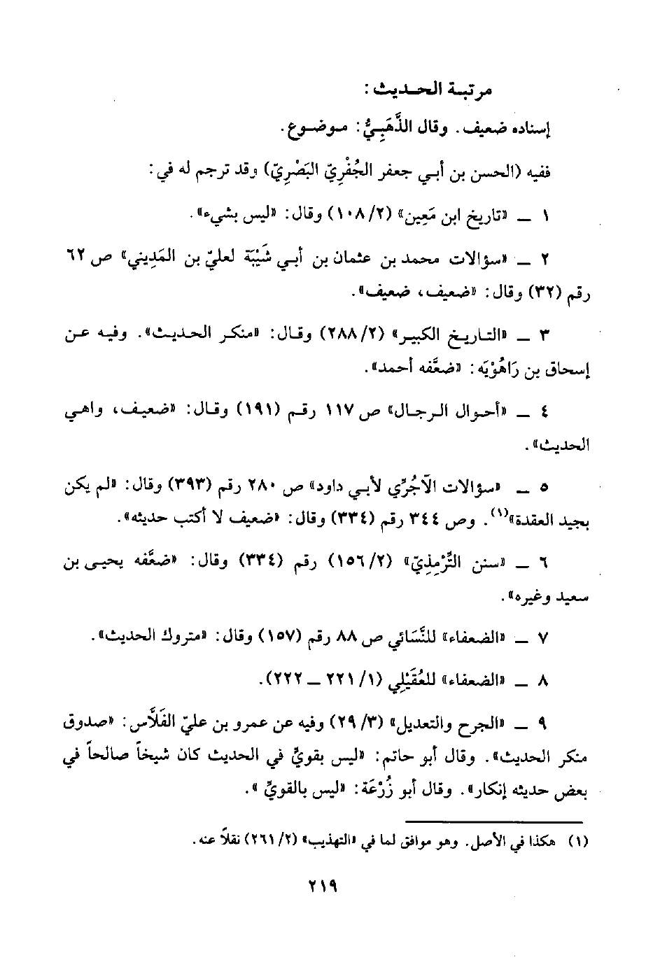 ٩ - "الجرح والتعديل" (٣/ ٢٩) وفيه عن عمرو بن عليّ الفَلَّاس: "صدوق منكر الحديث". وقال أبو حاتم: "ليس بقويٍّ في الحديث كان شيخًا صالحًا في بعض حديثه إنكار". وقال أبو زُرْعَة: "ليس بالقويِّ".