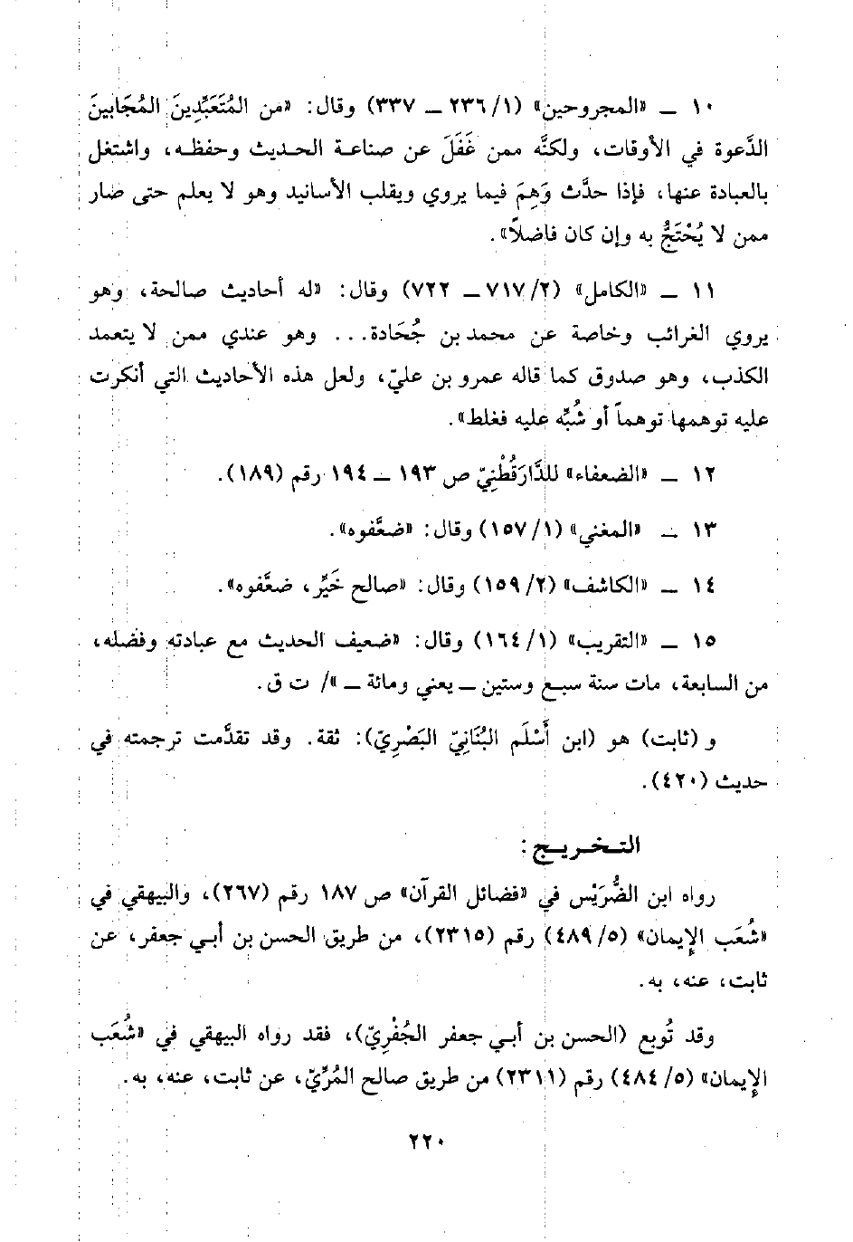 ١٠ - "المجروحين" (١/ ٢٣٦ - ٣٣٧) وقال: "من المُتَعَبِّدِينَ المُجَابينَ الدَّعوة في الأوقات، ولكنَّه ممن غَفَلَ عن صناعة الحديث وحفظه، واشتغل بالعبادة عنها، فإذا حدَّث وَهِمَ فيما يروي ويقلب الأسانيد وهو لا يعلم حتى صار ممن لا يُحْتَجُّ به وإن كان فاضلًا".