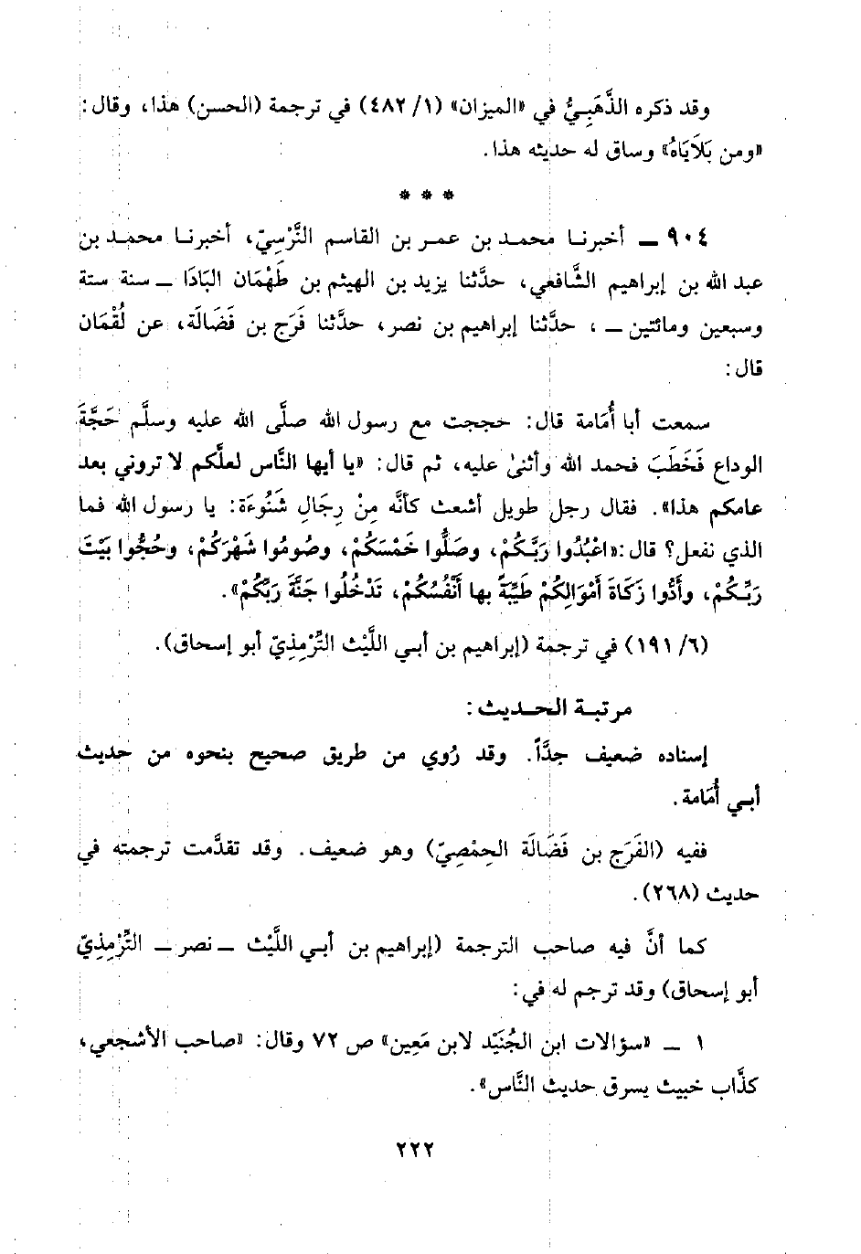 ٩٠٤ - أخبرنا محمد بن عمر بن القاسم النَّرْسِيّ، أخبرنا محمد بن عبد اللَّه بن إبراهيم الشافعي، حدَّثنا يزيد بن الهيثم بن طَهْمَان البَادَا -سنة ستة وسبعين ومائتين-، حدَّثنا إبراهيم بن نصر، حدَّثنا فَرَج بن فَضَالَة، عن لُقْمَان قال:
