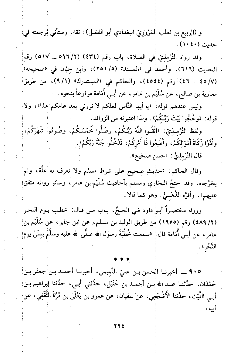 ٩٠٥ - أخبرنا الحسن بن عليّ التَّمِيمي، أخبرنا أحمد بن جعفر بن حَمْدَان، حدَّثنا عبد اللَّه بن أحمد بن حَنْبَل، حدَّثني أبي، حدَّثنا إبراهيم بن أبي اللَّيْث، حدَّثنا الأَشْجَعِي، عن سفيان، عن عمرو بن يَعْلَى بن مُرَّةَ الثَّقَفِي، عن أبيه،