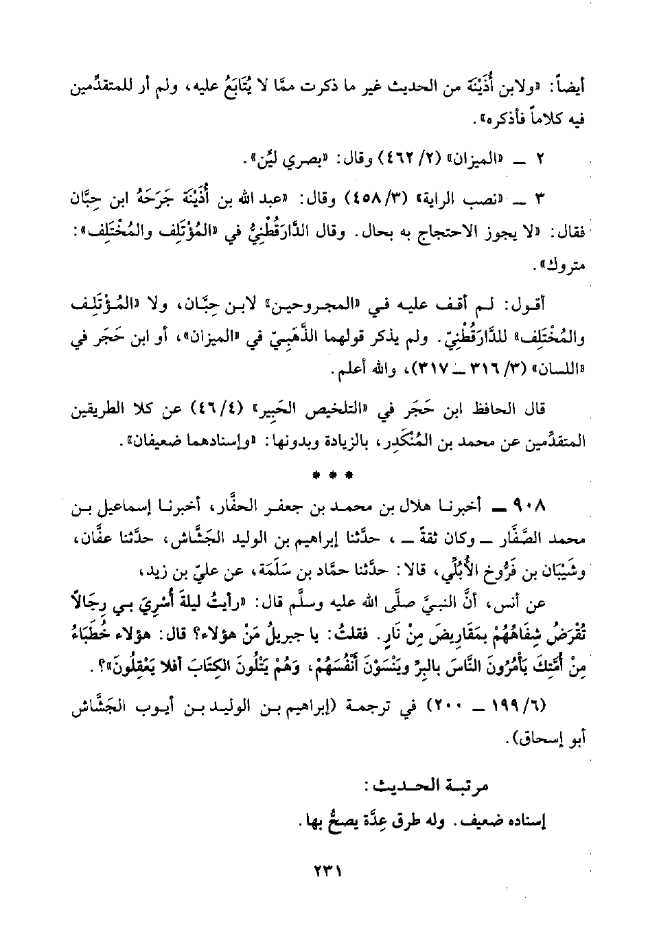 ٣ - "نصب الراية" (٣/ ٤٥٨) وقال: "عبد اللَّه بن أُذَيْنَة جَرَحَهُ ابن حِبَّان فقال: "لا يجوز الاحتجاج به بحال. وقال الدَّارَقُطْنِيُّ في "المُؤْتَلِف والمُخْتَلِف": متروك".