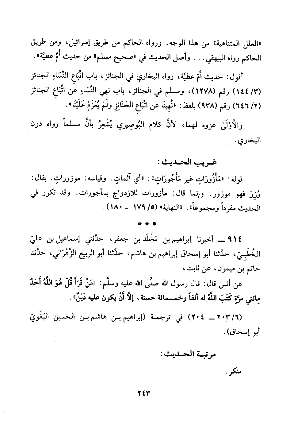 ٩١٤ - أخبرنا إبراهيم بن مَخْلَد بن جعفر، حدَّثني إسماعيل بن عليّ الخُطَبِيّ، حدَّثنا أبو إسحاق إبراهيم بن هاشم، حدَّثنا أبو الربيع الزَّهْرَاني، حدَّثنا حاتم بن ميمون، عن ثابت،