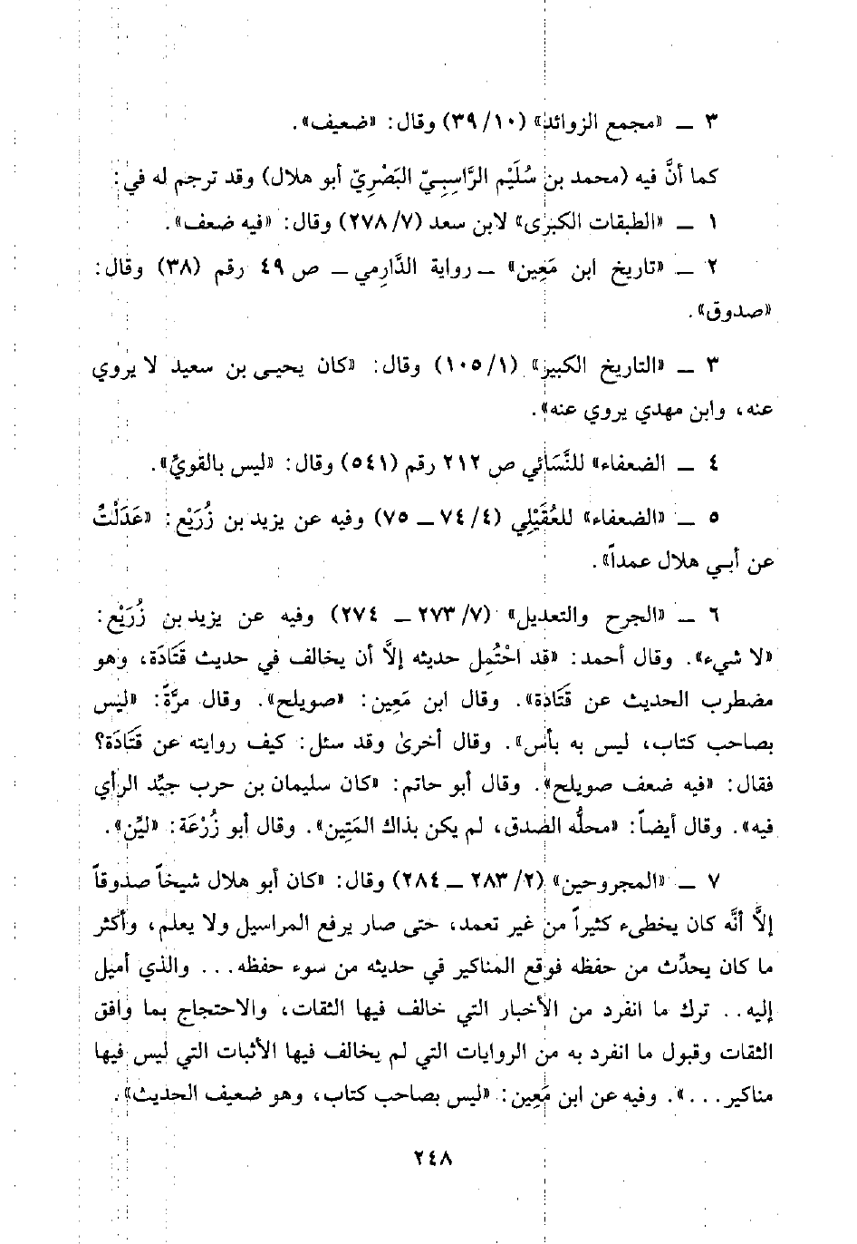 ٧ - "المجروحين" (٢/ ٢٨٣ - ٢٨٤) وقال: "كان أبو هلال شيخًا صدوقًا إلَّا أنَّه كان يخطئ كثيرًا من غير تعمد، حتى صار يرفع المراسيل ولا يعلم، وأكثر ما كان يحدِّث من حفظه فوقع المناكير في حديثه من سوء حفظه. . . والذي أميل إليه. . ترك ما انفرد من الأخبار التي خالف فيها الثقات، والاحتجاج بما وافق الثقات وقبول ما انفرد به من الروايات التي لم يخالف فيها الأثبات التي ليس فيها مناكير. . . . " وفيه عن ابن معين: "ليس بصاحب كتاب، وهو ضعيف الحديث".