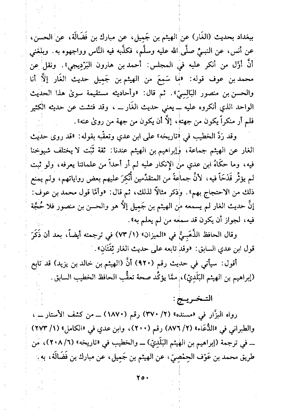 وقد رَدَّ الخطيب في "تاريخه" على ابن عدي وتعقّبه بقوله: "قد روى حديث الغار عن الهيثم جماعة، وإبراهيم بن الهيثم عندنا: ثقة ثَبْت لا يختلف شيوخنا فيه، وما حكَاهُ ابن عدي من الإِنكار عليه لم أر أحدًا من علمائنا يعرفه، ولو ثبت لم يؤثِّر قَدْحًا فيه، لأنَّ جماعةً من المتقدِّمين أُنْكِرَ عليهم بعض رواياتهم، ولم يمنع ذلك من الاحتجاج بهم". وذكر مثالًا لذلك، ثم قال: "وأمَّا قول محمد بن عوف: إنَّ حديث الغار لم يسمعه من الهيثم بن جَمِيل إلَّا هو والحسن بن منصور فلا حُجَّة فيه، لجواز أن يكون قد سمعه من لم يعلم به".
