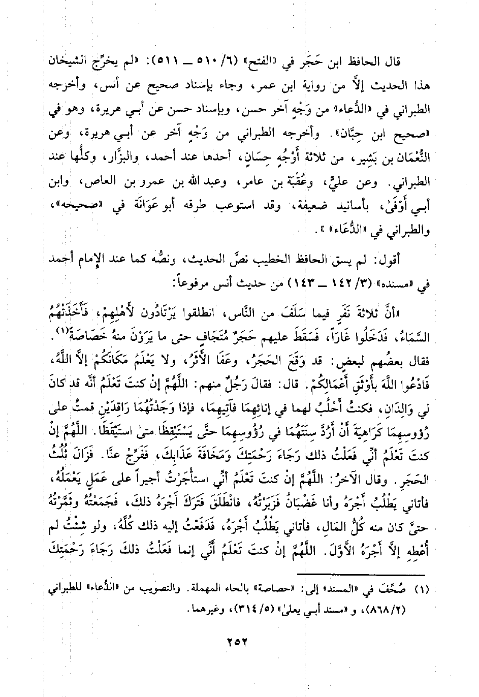 "أنَّ ثلاثةَ نَفَرٍ فيما سَلَفَ من النَّاس، انطلقوا يَرْتَادُون لأَهْلِهِمْ، فَأَخَذَتْهُمُ السَّمَاءُ، فَدَخَلُوا غَارًا، فَسَقَطَ عليهم حَجَرٌ مُتَجَافٍ حتى ما يَرَوْنَ منهُ خَصَاصَةً (¬١). فقال بعضُهم لبعضٍ: قد وَقَعَ الحَجَرُ، وعَفَا الأَثَرُ، ولا يَعْلَمُ مَكَانَكُمْ إلَّا اللَّهُ، فَادْعُوا اللَّهَ بأَوْثَقِ أَعْمَالِكُمْ. قال: فقالَ رَجُلٌ منهم: اللَّهُمَّ إنْ كنتَ تَعْلَمُ أنَّه قد كانَ لي وَالِدَانِ، فكنتُ أَحْلُبُ لهما في إنائِهِمَا فآتِيهِمَا، فإذا وَجَدْتُهُمَا رَاقِدَيْنِ قمتُ على رُؤوسِهمَا كَرَاهِيَةَ أَنْ أَرُدَّ سِنَتَهُمَا في رُؤُوسِهِمَا حتَّى يَسْتَيْقَظَا متى استَيْقَظَا، اللَّهُمَّ إنْ كنتَ تَعْلَمُ أنِّي فَعَلْتُ ذلك رَجَاءَ رَحْمَتِكَ وَمَخَافَةَ عَذَابِكَ، فَفَرِّجْ عنَّا. فَزَالَ ثُلُثُ الحَجَرِ. وقال الآخرُ: اللَّهُمَّ إنْ كنتَ تَعْلَمُ أنِّي استأْجَرْتُ أَجيرًا على عَمَلٍ يَعْمَلُهُ، فأتاني يَطْلُبُ أَجْرَهُ وأنا غَضْبَانُ فَزَبَرْتُهُ، فانْطَلَقَ فَتَرَكَ أَجْرَهُ ذلكَ، فَجَمَعْتُهُ وثَمَّرْتُهُ حتَّى كان منه كُلُّ المَالِ، فأتاني يَطْلُبُ أَجْرَهُ، فَدَفَعْتُ إليه ذلك كُلَّهُ، ولو شِئْتُ لم أُعْطِهِ إلَّا أَجْرَهُ الأَوَّلَ. اللَّهُمَّ إنْ كنتَ تَعْلَمُ أَنِّي إنما فَعَلْتُ ذلكَ رَجَاءَ رَحْمَتِكَ