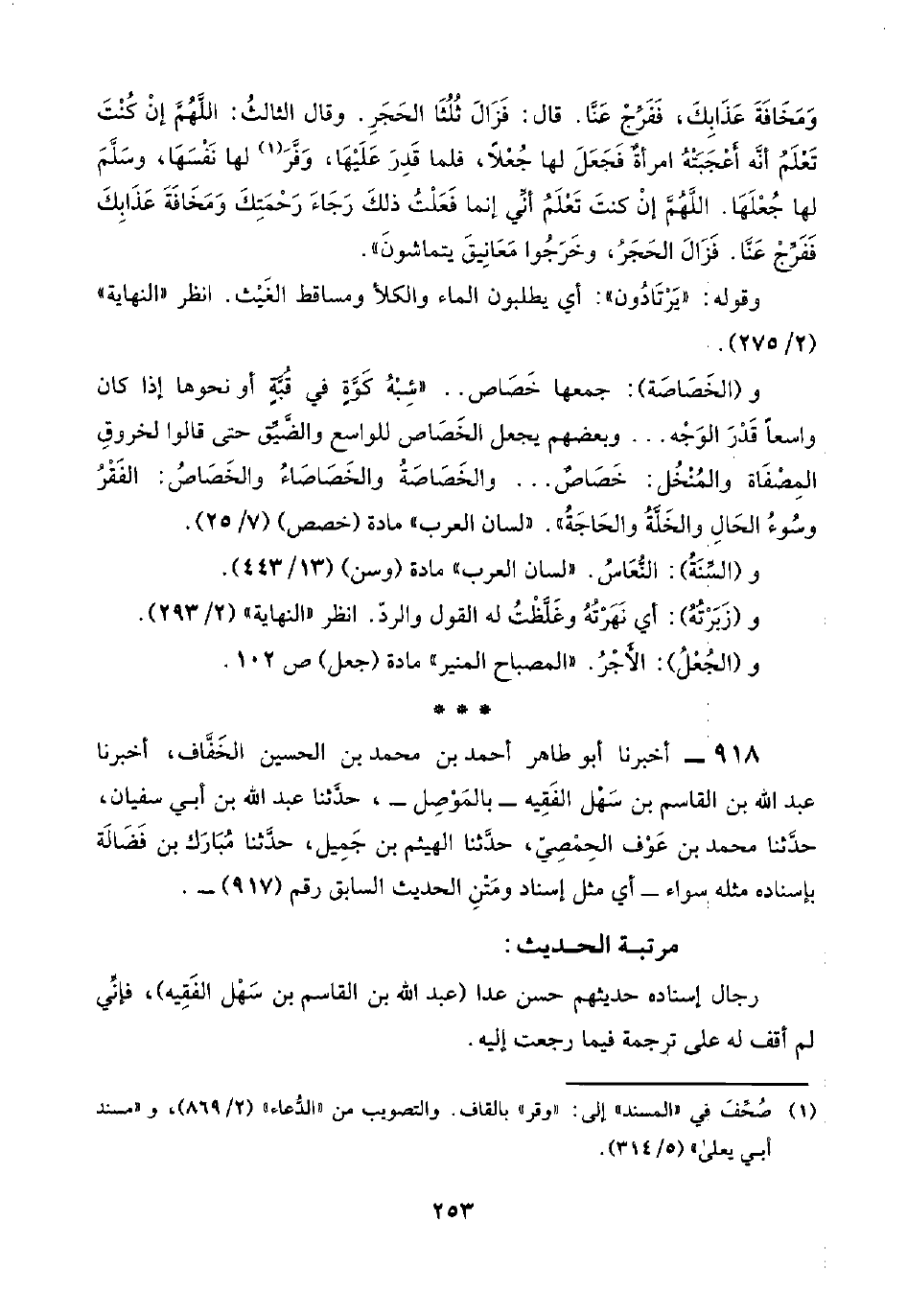 ٩١٨ - أخبرنا أبو طاهر أحمد بن محمد بن الحسين الخَفَّاف، أخبرنا عبد اللَّه بن القاسم بن سَهْل الفَقِيه -بالمَوْصِل-، حدَّثنا عبد اللَّه بن أبي سفيان، حدَّثنا محمد بن عَوْف الحِمْصِيّ، حدَّثنا الهيثم بن جَمِيل، حدَّثنا مُبَارَك بن فَضَالَة بإسناده مثله سواء -أي مثل إسناد ومَتْنِ الحديث السابق رقم (٩١٧) -.