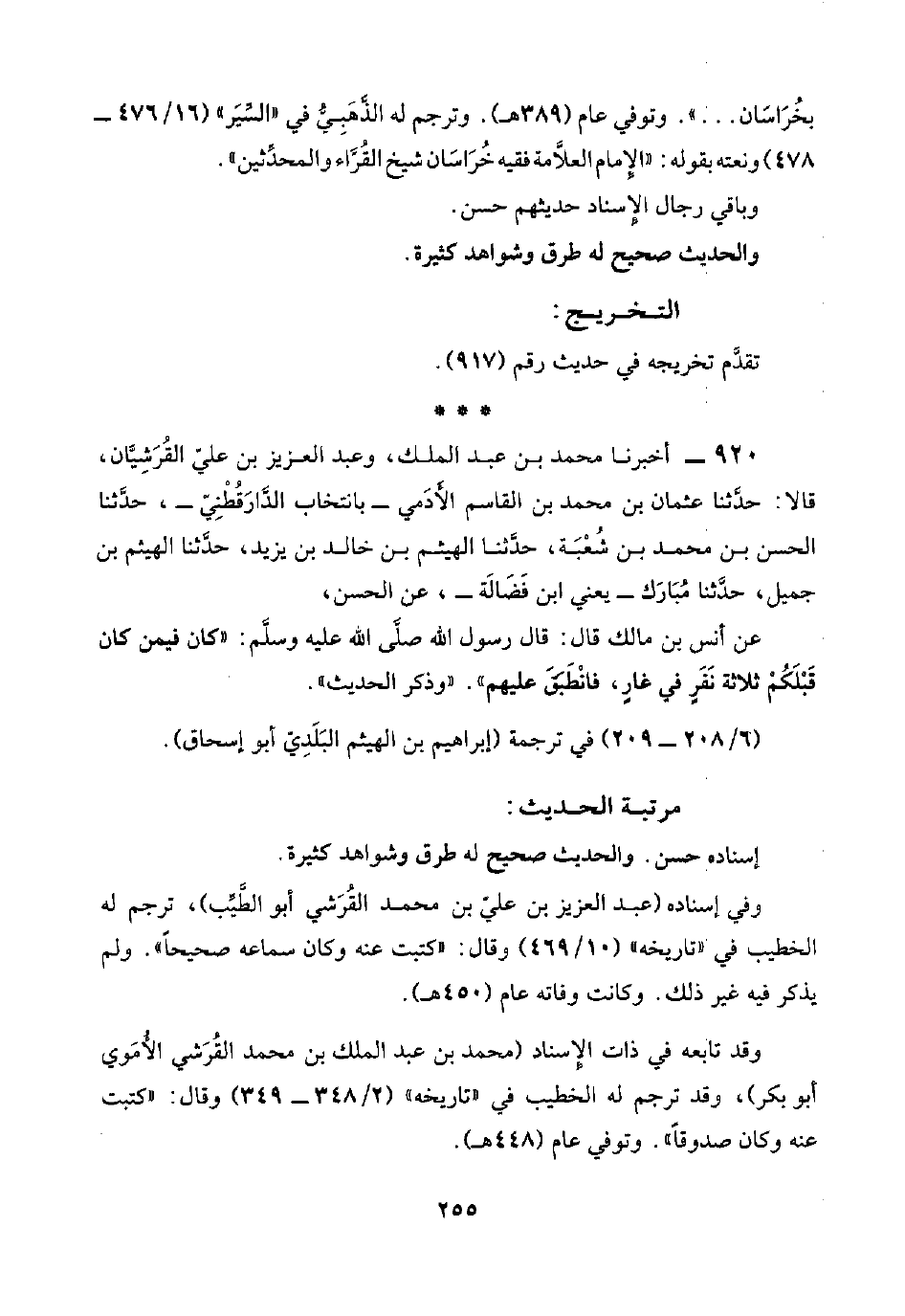 ٩٢٠ - أخبرنا محمد بن عبد الملك، وعبد العزيز بن عليّ القُرَشِيَّان، قالا: حدَّثنا عثمان بن محمد بن القاسم الأَدمي -بانتخاب الدَّارَقُطْنِيّ-، حدَّثنا الحسن بن محمد بن شُعْبَة، حدَّثنا الهيثم بن خالد بن يزيد، حدَّثنا الهيثم بن جميل، حدَّثنا مُبَارَك -يعني ابن فَضَالَة-، عن الحسن،
