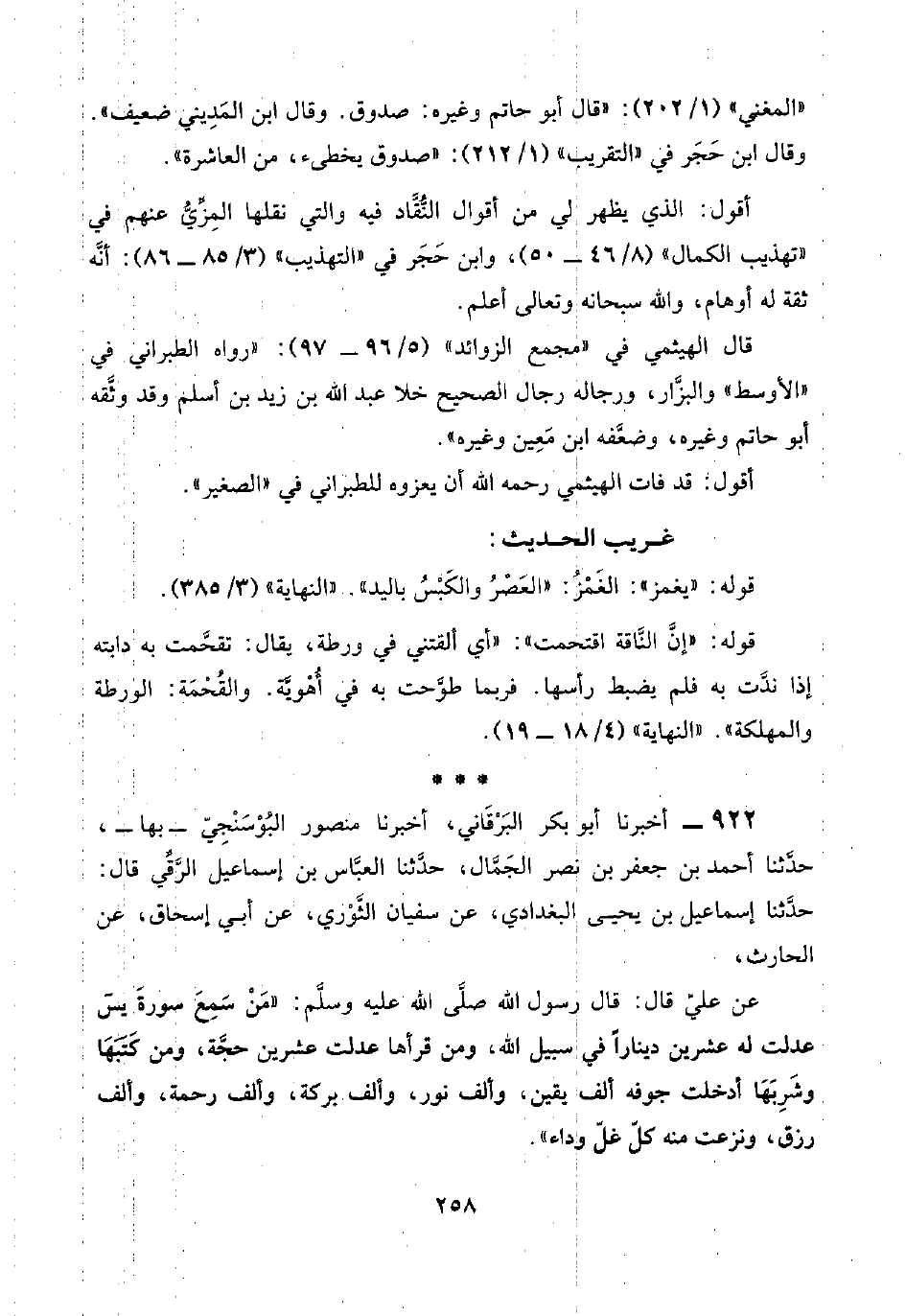 ٩٢٢ - أخبرنا أبو بكر البَرْقَاني، أخبرنا منصور البُوْسَنْجِيّ -بها-، حدَّثنا أحمد بن جعفر بن بصر الجَمَّال، حدَّثنا العبَّاس بن إسماعيل الرَّقِّي قال: حدَّثنا إسماعيل بن يحيى البغدادي، عن سفيان الثَّوْري، عن أبي إسحاق، عن الحارث،