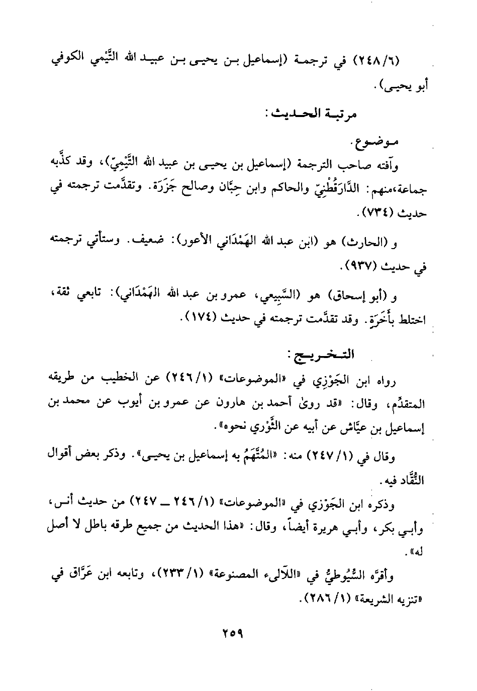 وقال في (١/ ٢٤٧) منه: المُتَّهَمُ به إسماعيل بن يحيى". وذكر بعض أقوال النُّقَّاد فيه.